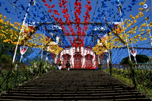Am Marienfeiertag (15. August) werden die Kirchen mit tausenden bunten Papierblumen geschmückt. Hier die Kirche von Monte oberhalb der Stadt.