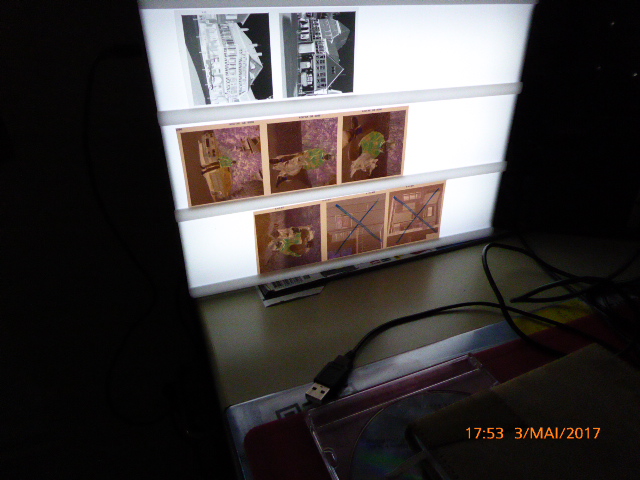Dein Leuchtpult leuchtet die Negative ungleichmäßig aus (helle und dunkle Streifen). Such dir die beste Fläche (verm. in der Mitte des Leuchtpults) aus.