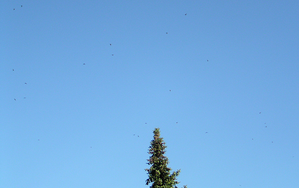 Apus apus (Mauersegler) bei der Nahrungsaufnahme. (Zufallstreffer - scharfstellen ist Glückssache)
