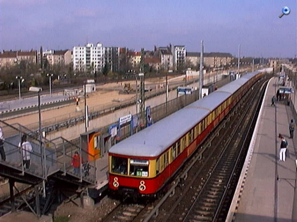 Ein Teil des Berliner S-Bahnhofs Bornholmer Str. Ein Ort, der Ende 1989 eine gewisse Bedeutung bei der Öffnung der Berliner Mauer erlangte. Links im Hintergrund "Ost-Berlin". Davor der ehemalige Grenzstreifen.