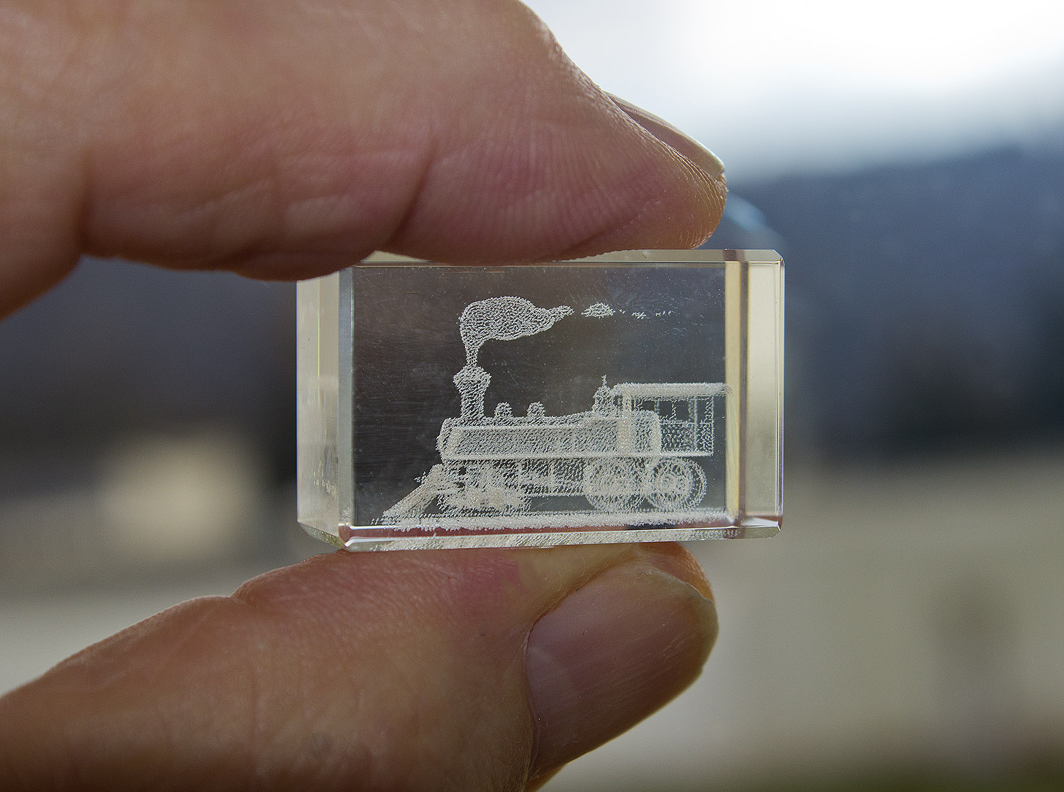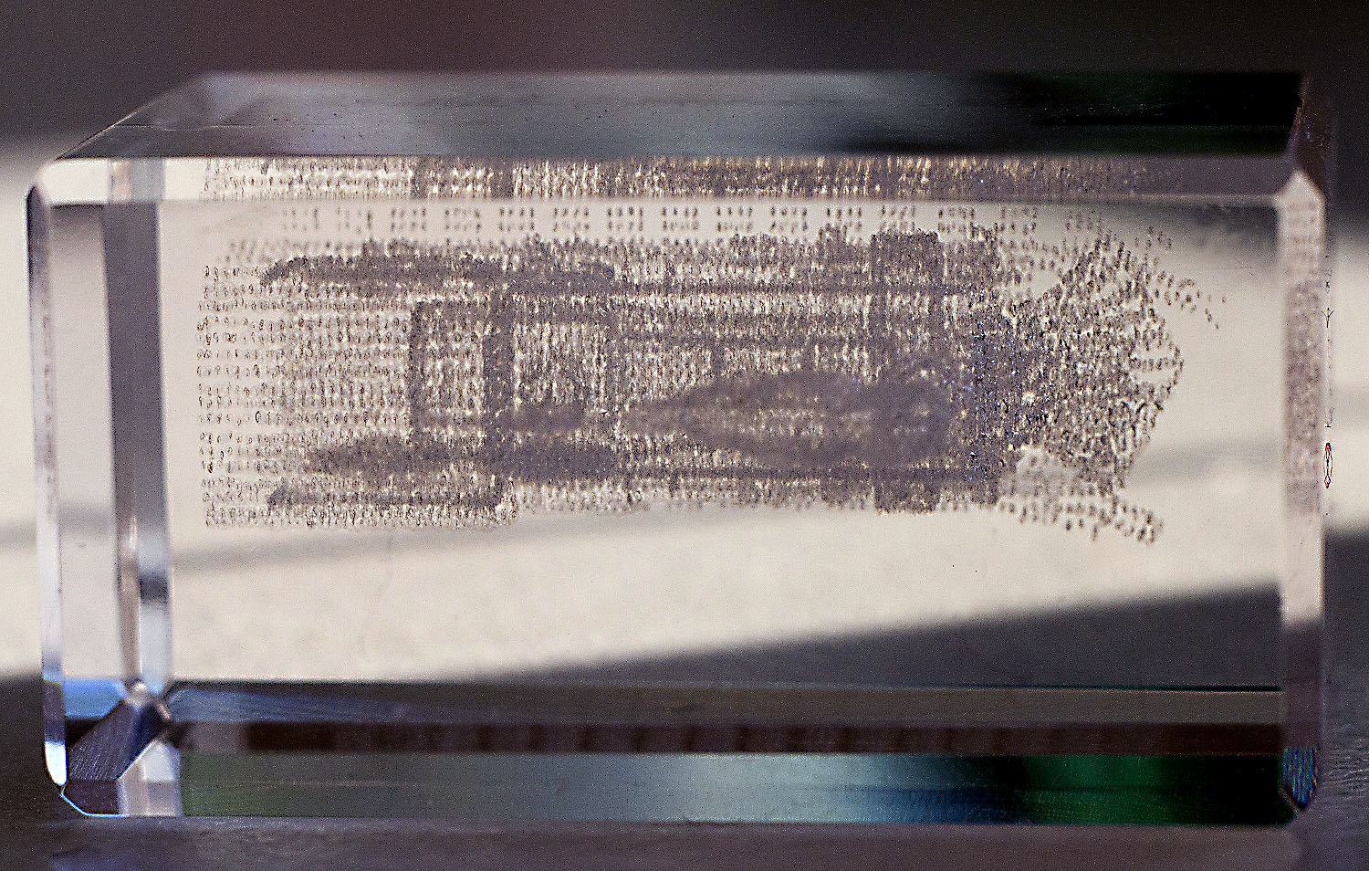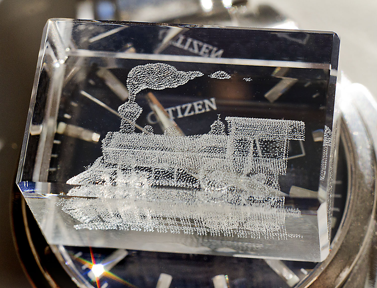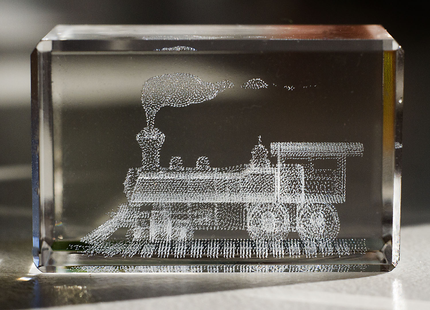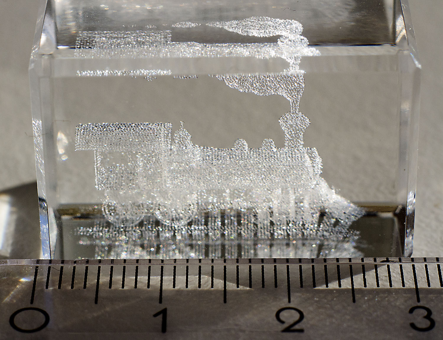 Eben habe ich als Neujahrsmitbringsel einen kleinen, 3x2x1,5 cm großen Glasquader mit einer 3D-Dampflok bekommen. Die Makrobilder davon möchtre ich ins neue Jahr mitgeben. Prosit Neujahr!