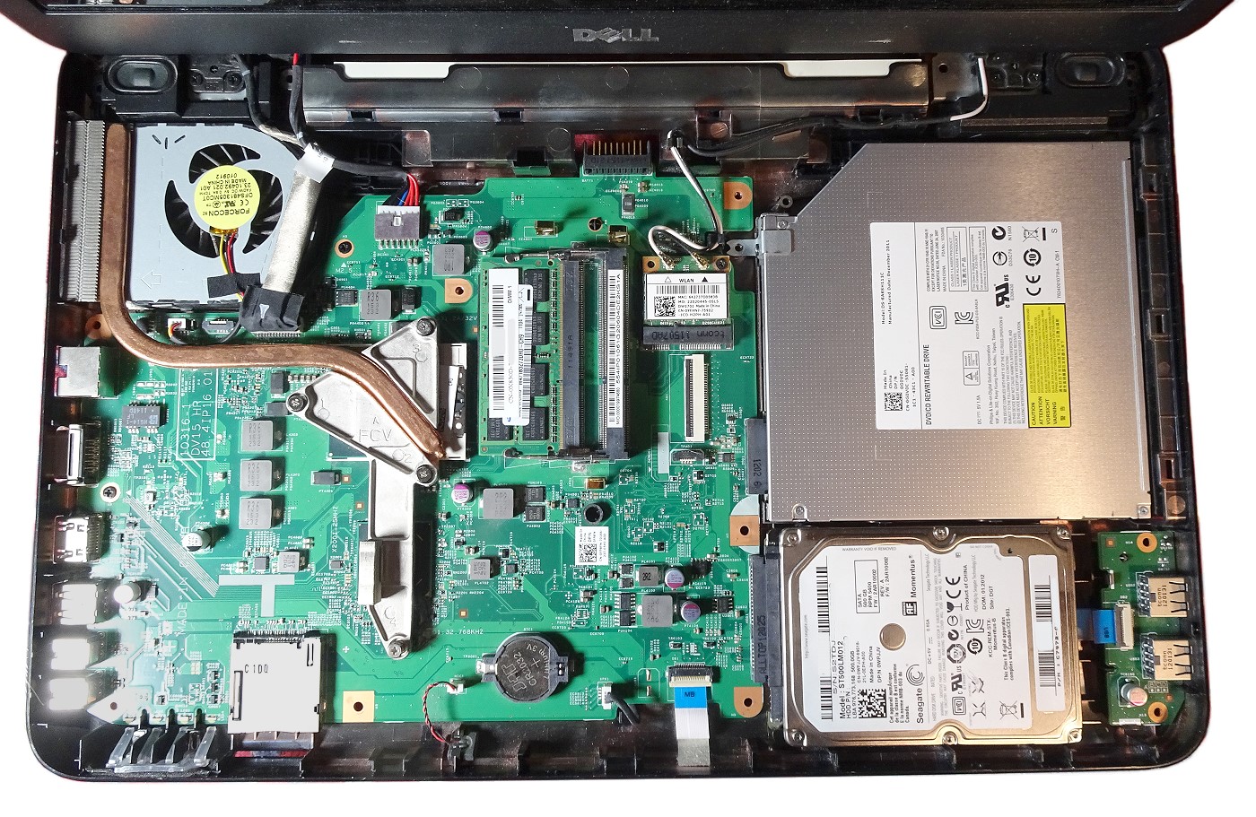 die meisten Leute kennen das Innenleben ihres Laptop PC oder Tablet-PC nicht. Ich habe vor der Entsorgung eines alten Laptop-PC von Dell beim Ausbau der Festplatte gleich mal ein Foto des Inneres des PC gemacht und dafür die Sony DSC-HX90 genutzt. Zuerst eine verkleinerte Übersichtsaufnahme, dann ein 1:1 Ausschnitt daraus: