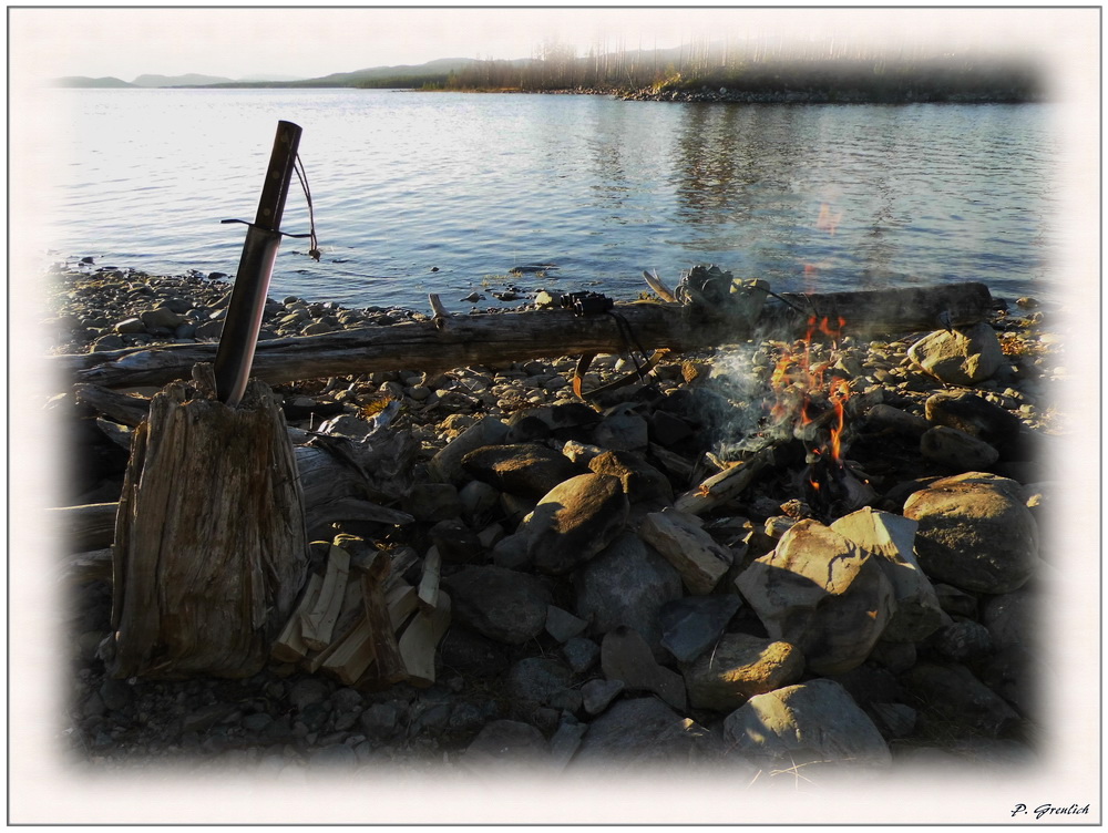 Auch ein schoener Ort, um den Tag in Ruhe ausklingen zu lassen. Kein Verkehrslärm, kein anderer Mensch, soweit das Auge reicht. Aber es ist nicht still hier. Das Feuer knistert. Draussen auf dem See die Stimme der Wildnis, mehrere Prachttaucher. Sie versuchen, sich gegenseitig zu übertönen. Ich genieße diese Art von Lärm. Für mich ist es Musik.