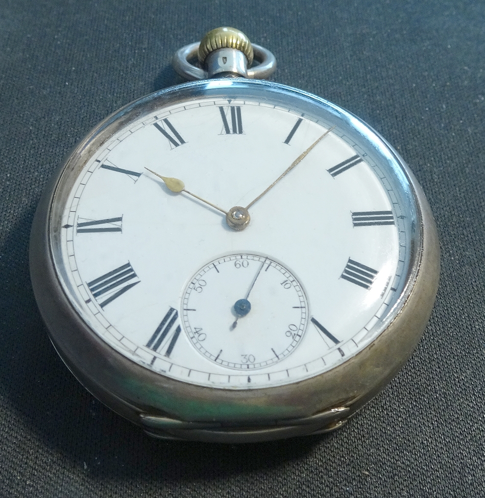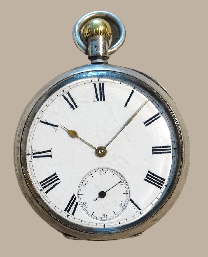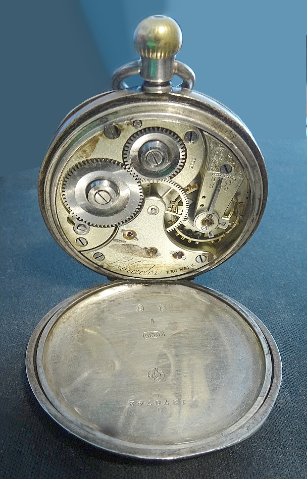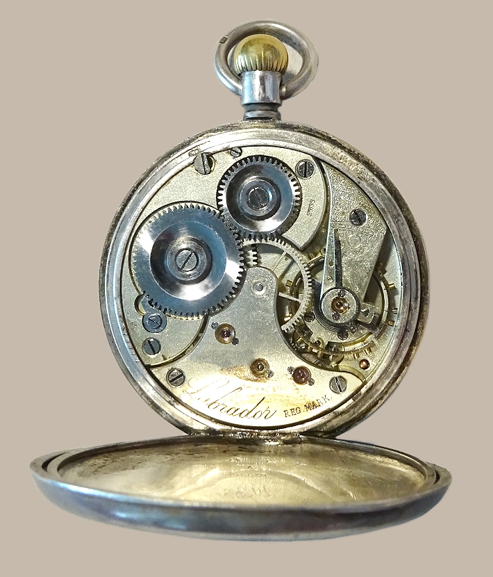 hier eine einfache silberne Taschenuhr von ca. 1915 des Herstellers Labrador (Omega), erstanden 1977 auf dem Chelsea Antique Market in London für 3 Pfund. Eine Palletten-Anker Uhr mit Kompensationsschrauben auf der Unruh.