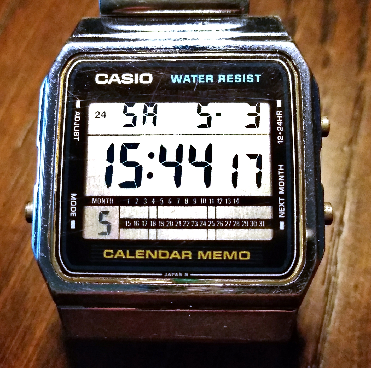 ja, die Casio. Als Jungmanager hatte ich mir Ende der 80er Jahre diese Casio gekauft, weil sie einen Kalender mit Terminen anzeigen konnte. Siehe die beiden schwarzen Balken unten. Die dünnen vertikalen Linien sind die Sonntage. Wenn man den Knopf rechts unten drückt, erscheint sogar der Folgemonat