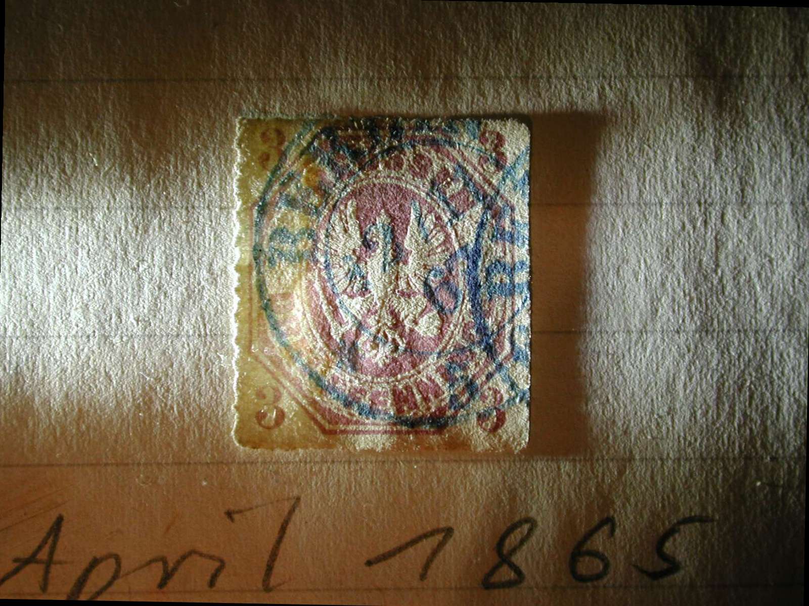 Dazu kam noch eine, die nur 156 Jahre alt ist, aber hübsch geprägt, die preussische Drei-Pfennig-Marke. Das Blatt auf ein Taschenbuch "So näht der Mann" gelegt, eine LED-Taschenlampe Fenix E12 davor gelegt, mit einer Gebrauchsanleitung einer antiken Ideal-Nähmaschine etwas erhöht, sodass ihr gebündelter Lichtstrahl das Motiv gerade streifte, und schon erzielte ich ein Foto, das die Prägung betont: Wieder einmal erwies sich die über 20 Jahre alte Nikon Coolpix 990 als die beste Wahl im Haushalt für eine Makroaufnahme!
