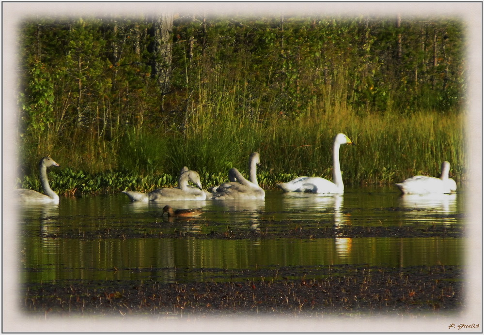 wieder mal auf einem Abendspaziergang ist mir etwas begegnet, das Euch vielleicht interessieren könnte. Eine Famililie von Singschwänen (Cygnus cygnus), nicht zu verwechseln mit den in Mitteleuropa verbreiteteren Höckerschwänen. Singschwäne sind Brutvögel der Taiga. Im Herbst und Winter sieht man sie aber auch in Mitteleuropa. Diese Familie hier besteht aus fünf Schwanenkindern, den Schwaneneltern und einer Ente, die vermutlich adoptiert wurde.