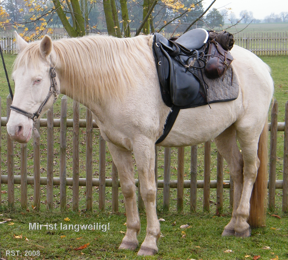 das Pferd sah ich bei einem Besuch des "Gut Hesterberg" bei Neuruppin. Es stand einsam und verlassen da, irgendwie wie vergessen. Die Körpersprache sagt wohl : "Mir ist langweilig!".
