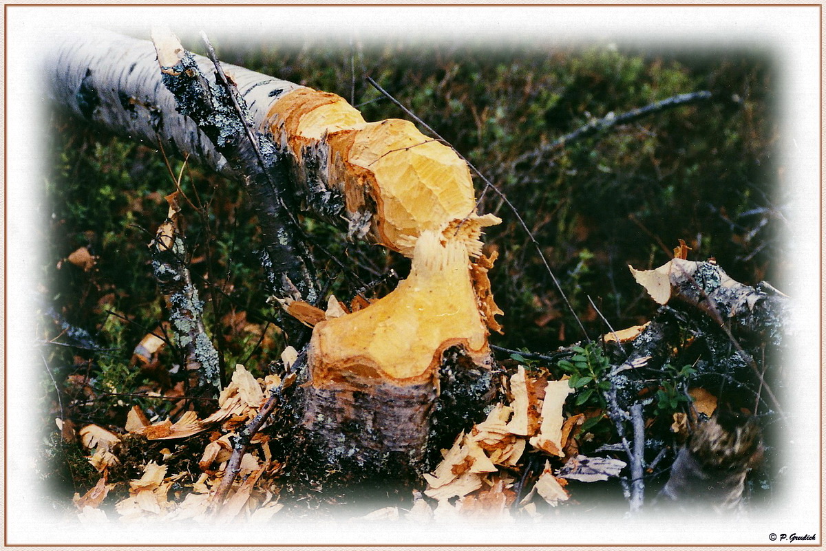 Es zeigt eine angeknabberte Birke. Ein Biber hat ganze Arbeit geleistet. Das Bild stammt noch aus dem vergangenen Jahrtausend und womit ich es gemacht habe, kann ich jetzt nicht mehr nachhalten. Sicher ist nur, dass es keine Digitalkamera war. :-)