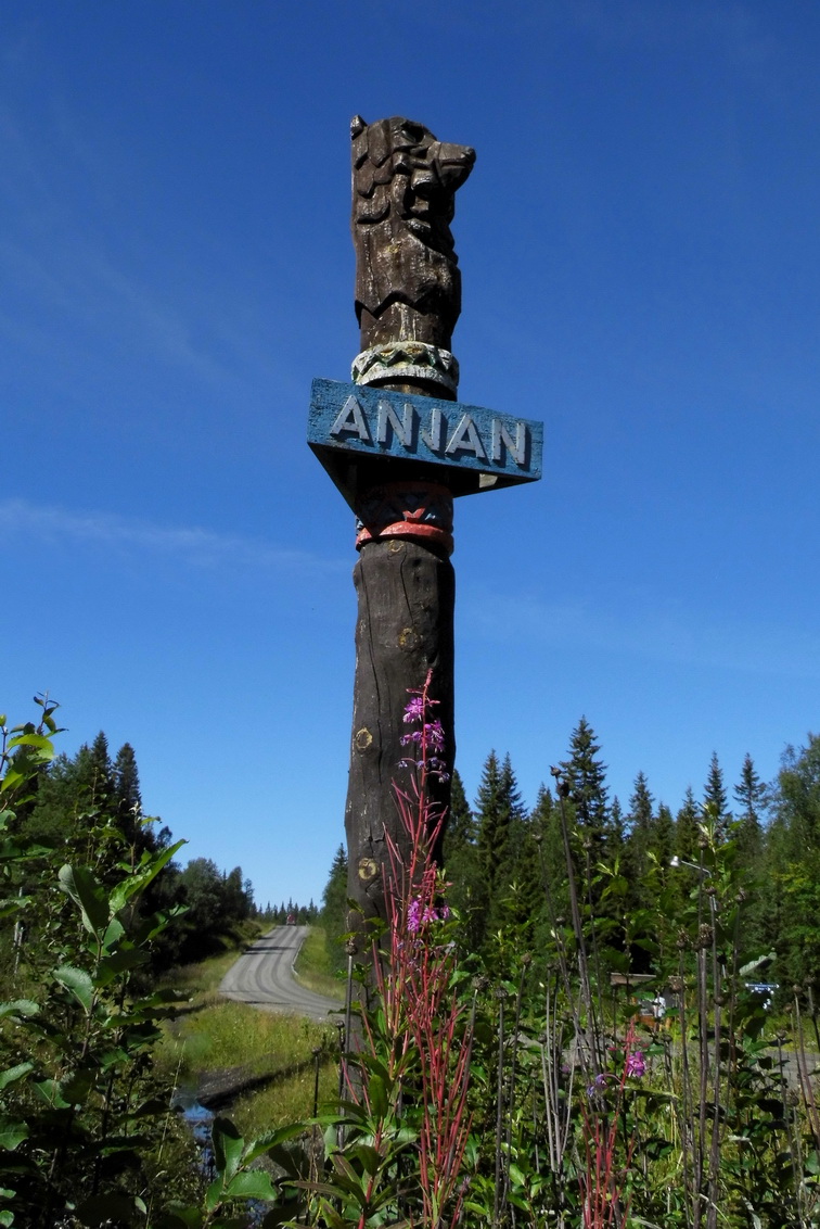 Totem bei Anjans Fjällstation. Die Herberge für Wanderer steht einsam in einer Landschaft mit grossen Seen und auch im Hochsommer noch mit Schneefeldern besetzten Bergen. Diese Anlage hat schon viele Jahrzehnte auf dem "Buckel". Irgendwo hab ich mal gelesen, dass der Erbauer ein Freund kanadischer und alaskanischer Wildnisgebiete und der Bauweise dort war. Hier hat er sich seinen Traum in schwedische Natur übertragen.