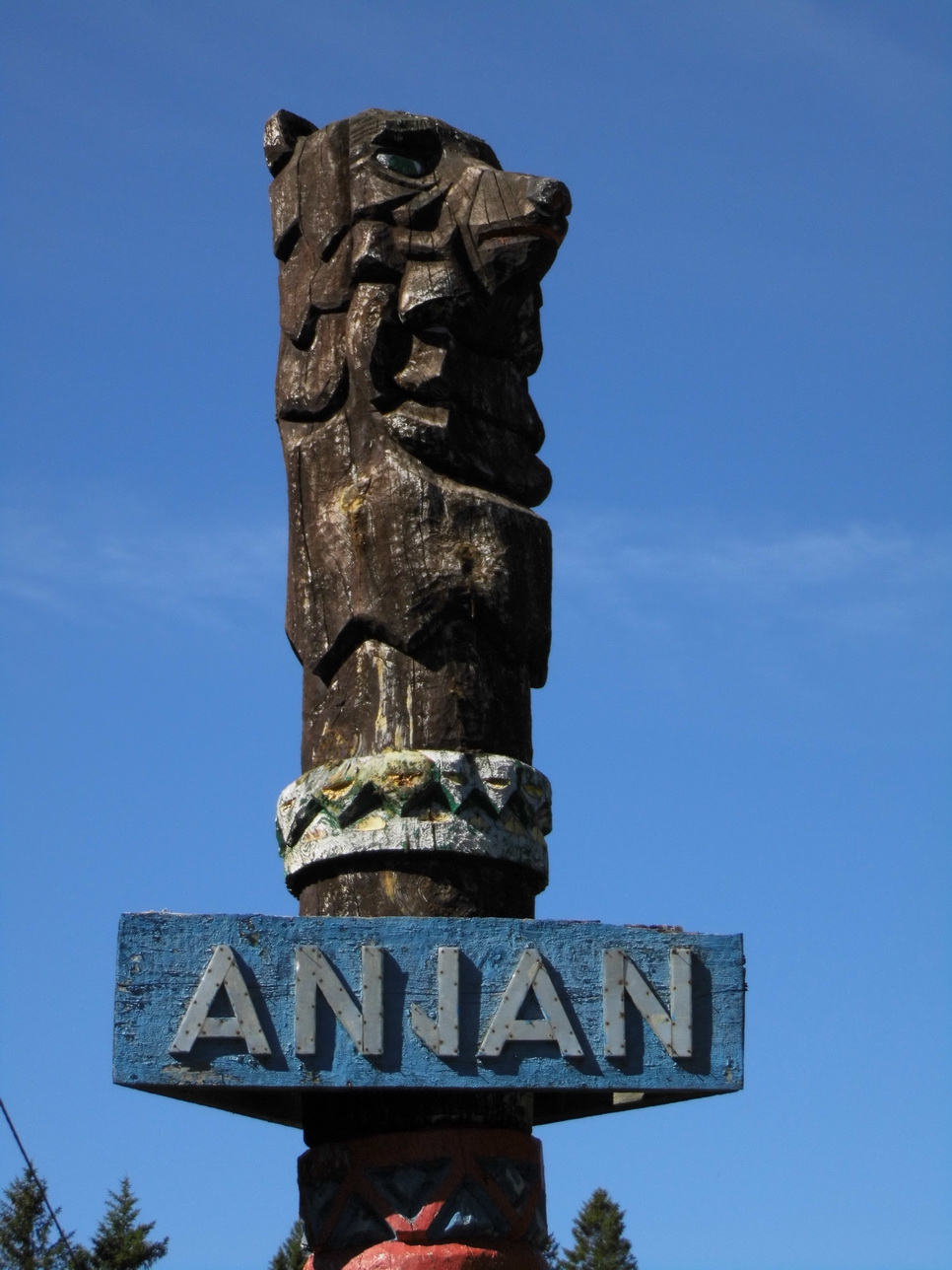 Aber mein Fotomotiv war ja der Totempfahl in der Einfahrt und nicht das Gebäude selbst. Hier ist er: