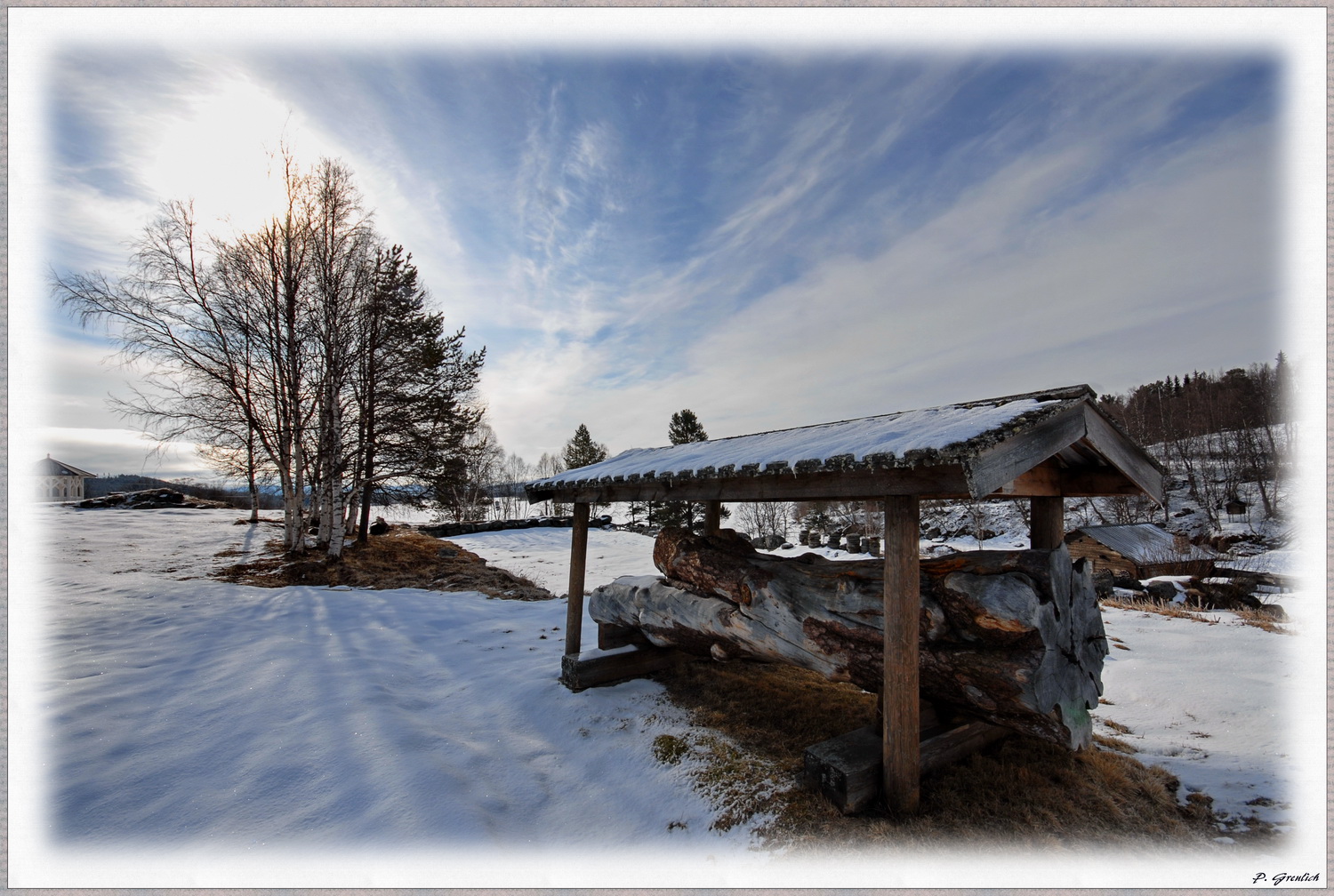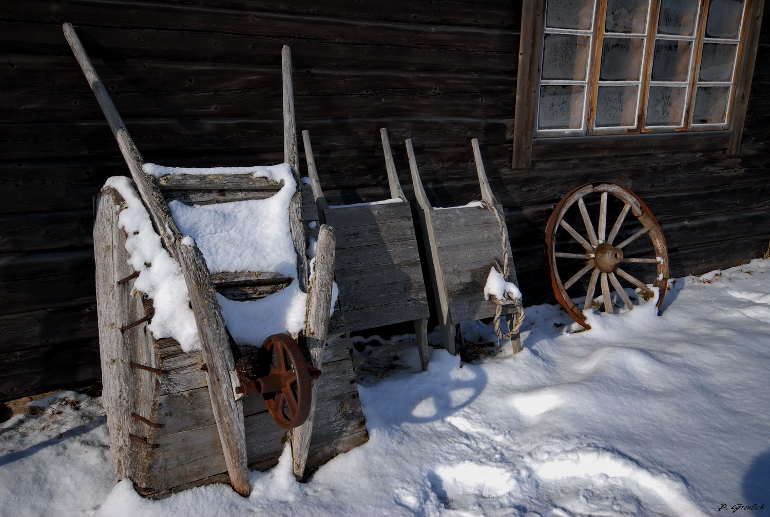 hier hab ich mal wieder was zum Thema Holz. In einem der umliegenden Dörfer sah ich an der Außenwand einer alten wassergetriebenen Schmiede ein paar sehr alte Hilfsmittel für den manuellen Transport von - weiß der Geier was - angelehnt. Besonders beeindruckt hat mich die verwitterte Schubkarre. Auf der Detailaufnahme kann man die darauf wachsenden Flechten erkennen. Ein weiteres Bild zeigt die Umgebung dieser historischen Anlage mit einem knorzigen Stamm im Vordergrund.