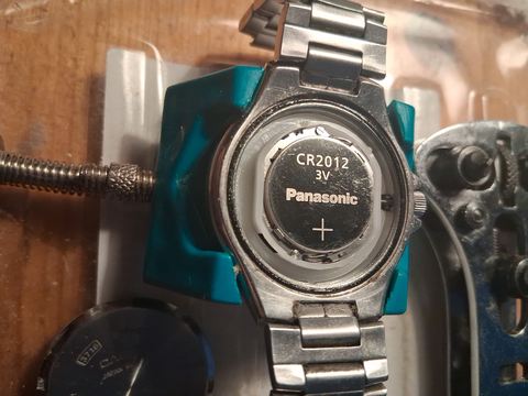 Erfreulicherweise haben die Casio und baugleiche Uhren handelsübliche Lithium-Langzeitbatterien, wie man sie auch in Größen für Computermainboards, die Steuerplatine im Heizkessel, für den Autoschlüssel etc. im Versand weit unter 1 Euro pro Stück bekommt, hier die CR2012. Die ersten zwei Ziffern der Nummer besagen den Durchmesser in mm, die folgenden stehen für Zehnteilmillimeter - diese hier ist also 1,2 Millimeter dick. Ich meine mich zu erinnern, daß auch in einer meiner Mittelformat-Kameras so ein Flachmann in einer winzigen Schublade eingebaut ist.