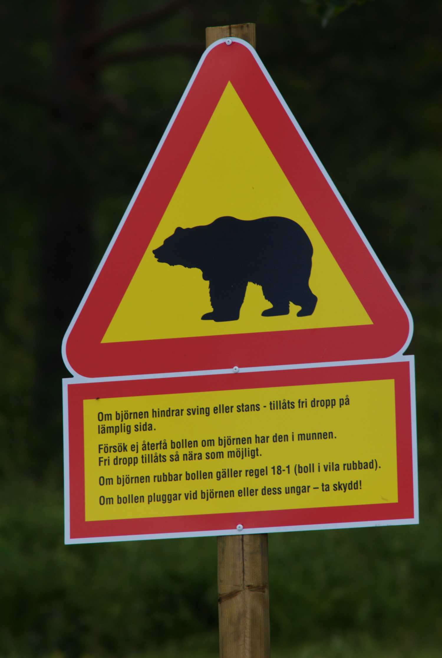 Das Bärenwarnschild steht übrigens am Rande eines Golfplatzes und enthält nicht ganz ernst gemeinte Spielanweisungen für Golfer bei Bärenbegegnungen.