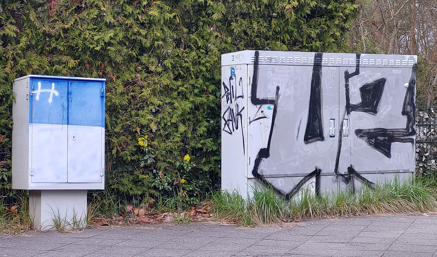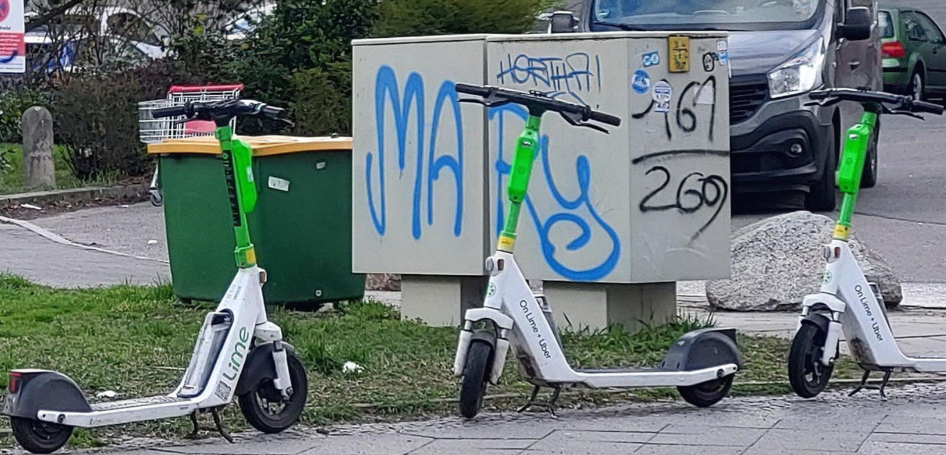 weiter geht es: Quasi-dominant tauchen sie immer mehr auf die E-Scooter, E-Miet-Bikes, aber auch Kommunikations-Verteiler am Strassenrand. Insbesondere die hässlichen Kästen werden gern genial oder sub-genial "verschönert". Nicht jeder Graffiti-Künstler ist begnadet, einige schon.