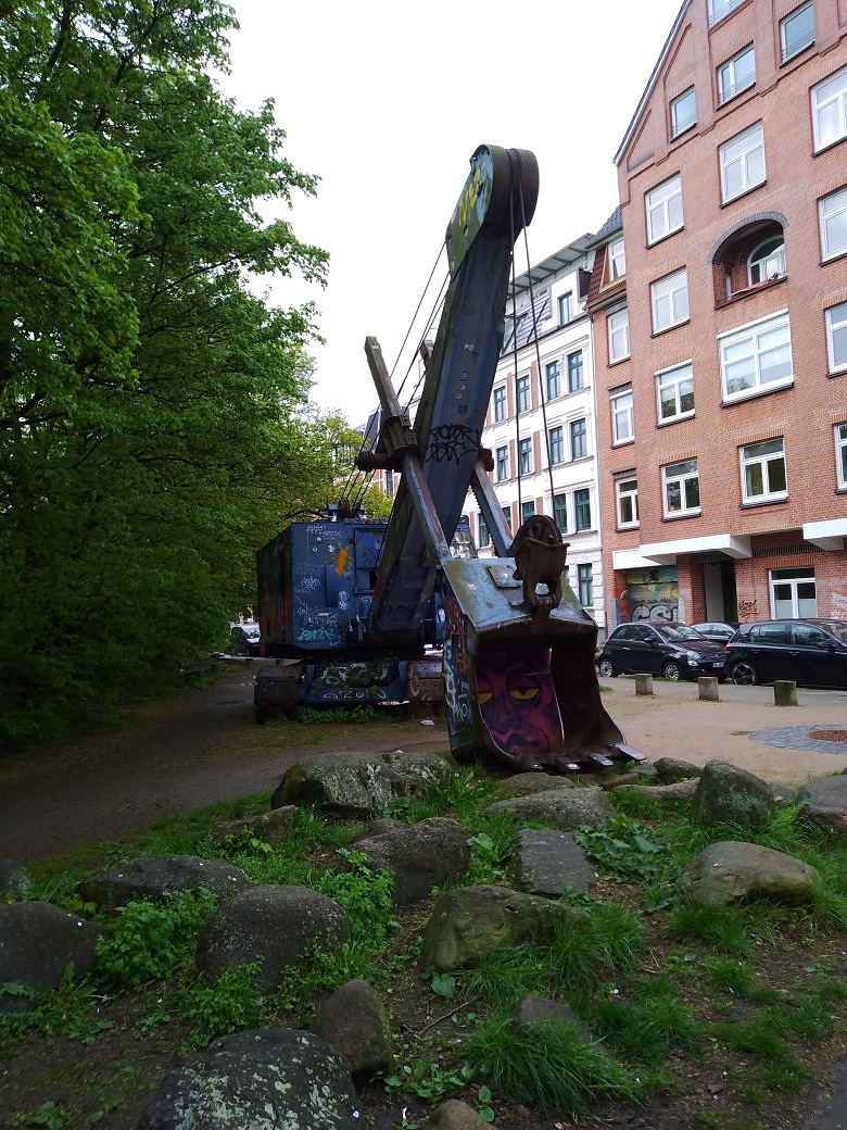 funktionstüchtig ist der Bagger wohl schon seit einigen Jahren nicht mehr. Er soll dort viel mehr an die Firma Menck & Hambrock erinnern die 1868 in Ottensen gegründet wurde und dort auch viele Jahre ihren Sitz hatte. Leider fühlen sich bei solch einem ungeschützten Exponat "Künstler" dazu aufgerufen, ihre "Kreativität", oder was immer sie dafür halten, auszuleben. Instandgesetzt und bei Tagen für historische Baumaschinen vorgeführt würde ich persönlich diesen Bagger lieber sehen.