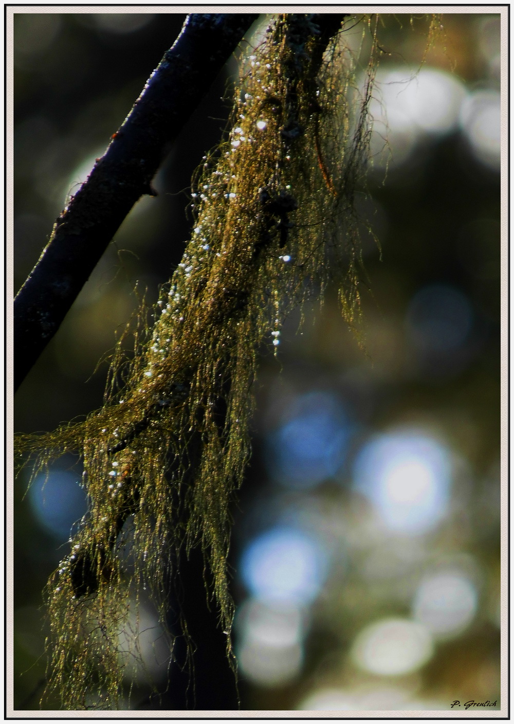 ...so sah es aus, als ein Sonnenstrahl auf diese Bartflechte mit Regentropfen fiel. Bekanntlich ist ja nicht alles Gold, was glänzt...aber andererseits...es muss ja auch nicht immer Gold und Geschmeide sein. Für das Auge gibt es eine Menge schöner Dinge, die nichts kosten. Man muss nur genau hinsehen.