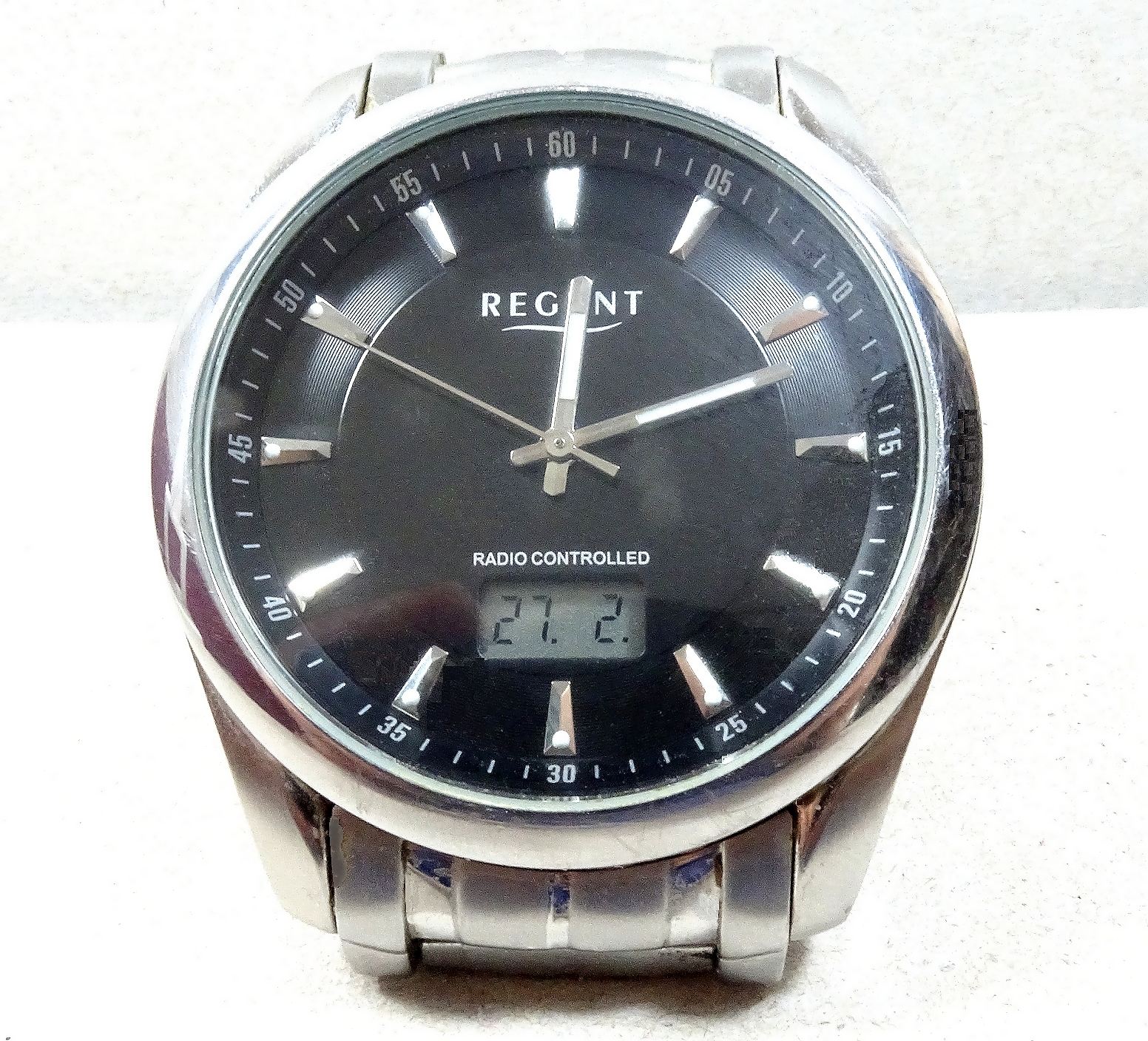 Eine ca. 12 Jahre alte Regent Funkuhr ohne Solar ohne Einstellkrone, nur zwei Mircotaster an den Seiten. Immerhin zeigt sie auf einem kleinen Display wahlweise Tag und Monat oder aber Sekunden und Funkempfang an.