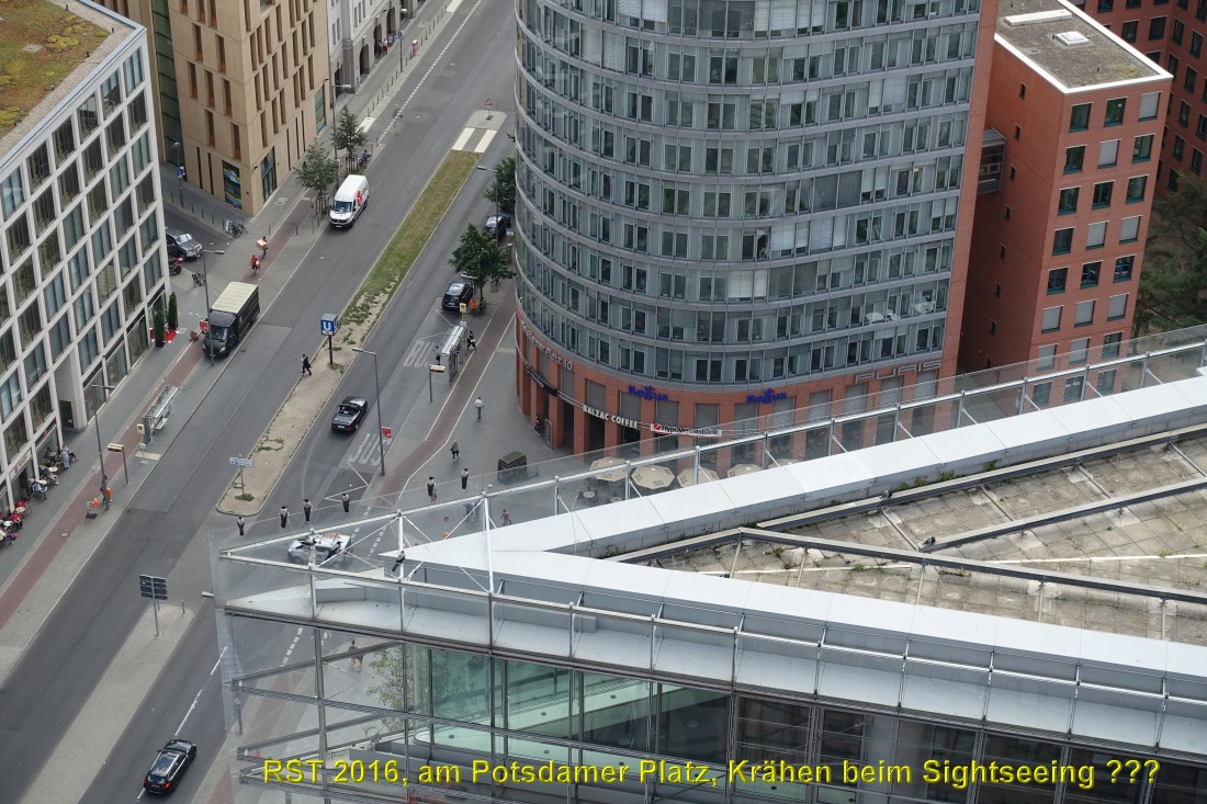Potsdamer Platz, Berlin. Blick vom 103 Meter hohem Kollhoff-Tower. Beim Betrachten der Foto in 1:1 Größe viel mir auf: Einige Krähen haben bequem Platz auf einem kleineren Hochhaus genommen und genießen die Aussicht...