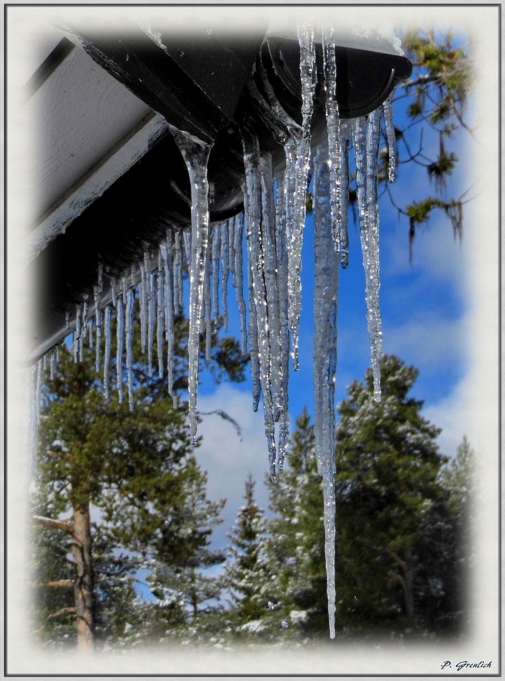 immer noch ist es hier im schwedischen Jämtland/Härjedalen Winter. Immer noch liegt hier meterhoch dies weisse kalte Zeugs herum, das sich meiner Ansicht nach besser in einem anderen Aggregatzustand in murmelnden Bächen, rauschenden Wasserfällen oder stillen Seen tummeln sollte. Aber gelegentlich kommt die inzwischen wieder etwas kraftvollere Sonne durch. Sie verwandelt die weissen Hauben auf den Dächern in durchsichtige Zähne, die von den Dachrinnen hängen.