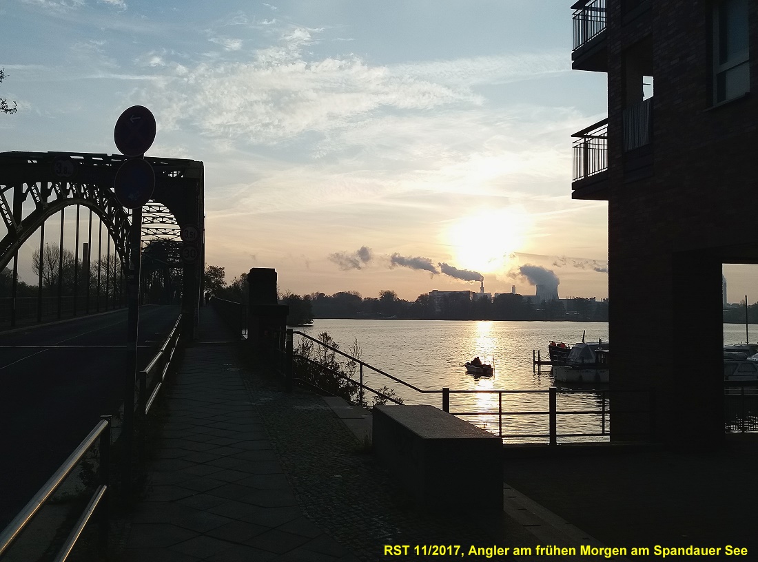 4 Grad Celsius, 7:00 Uhr, 4.11.17. Am Spandauer See in Berlin, links die Brücker zur Insel Eiswerder. Im Hintergrund das Kraftwerk Ernst Reuter. Mutig und unverdrossen ein Angler.