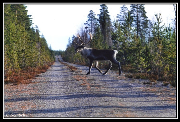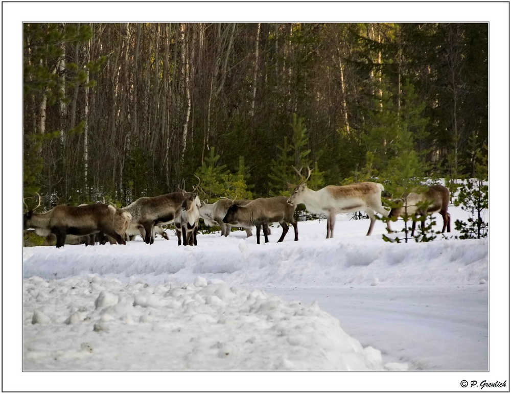 Eine Gruppe Rentiere. Hier im westlichen Härjedalen/Schweden fast ein alltägliches Bild. Diese Gegend ist Rentierzüchtergebiet, Samenland. Gerade im Winter trifft man die Rene oft in den Tälern. Während des Sommers halten sie sich am liebsten oben in den Bergen auf. Dort, wo der Wind ihnen die nervigen Mücken vom Leib hält.