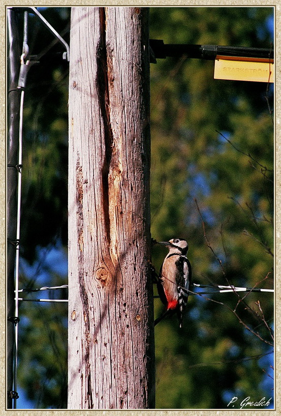 Eines muss man den Leuten von der NSA ja lassen. Sie tarnen sich perfekt. Diesen Agent erwischte ich an meiner Telefonleitung. Er hatte sich als Specht verkleidet. Hellhörig geworden durch die bekannt gewordenen Abhöraktionen der vergangenen Zeit war mir sofort klar, womit ich es hier zu tun hatte.