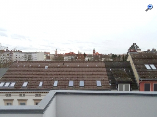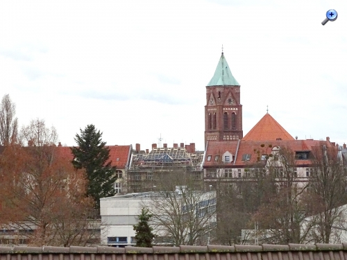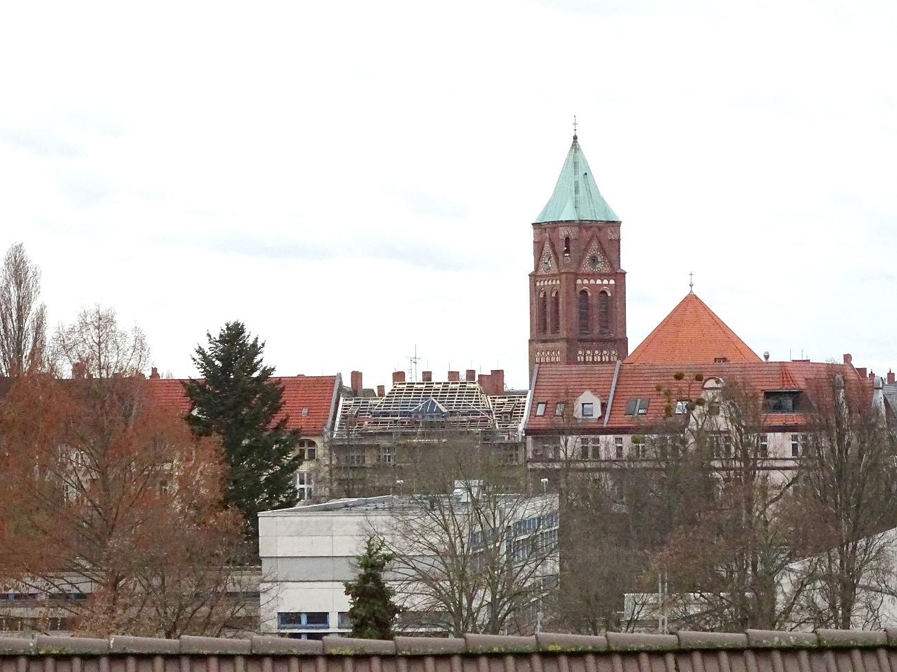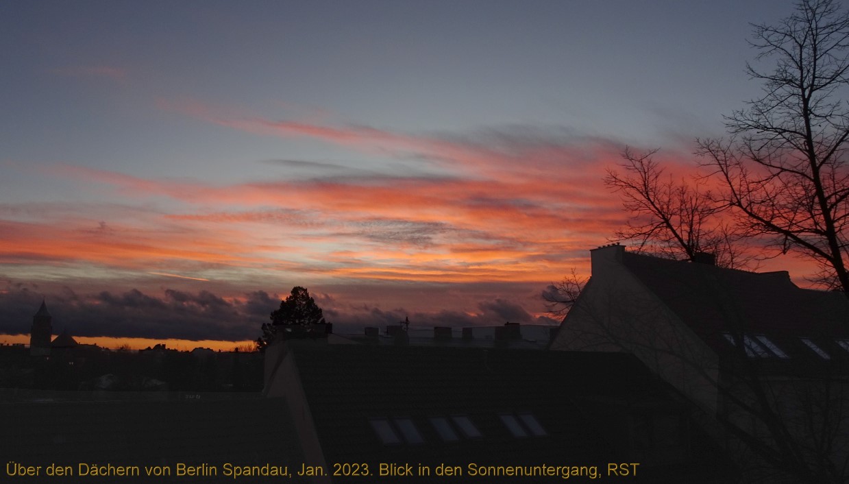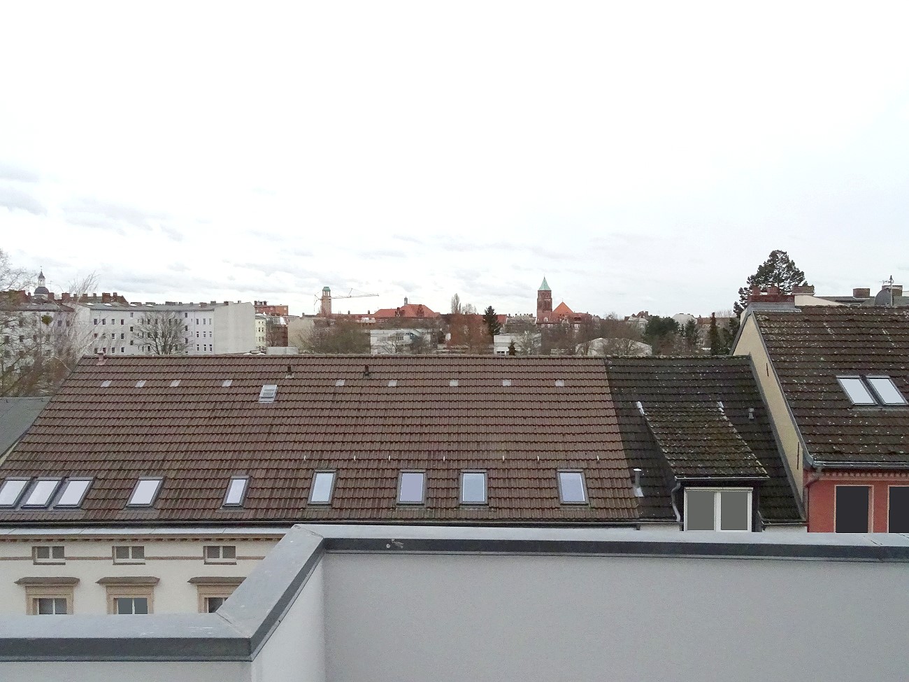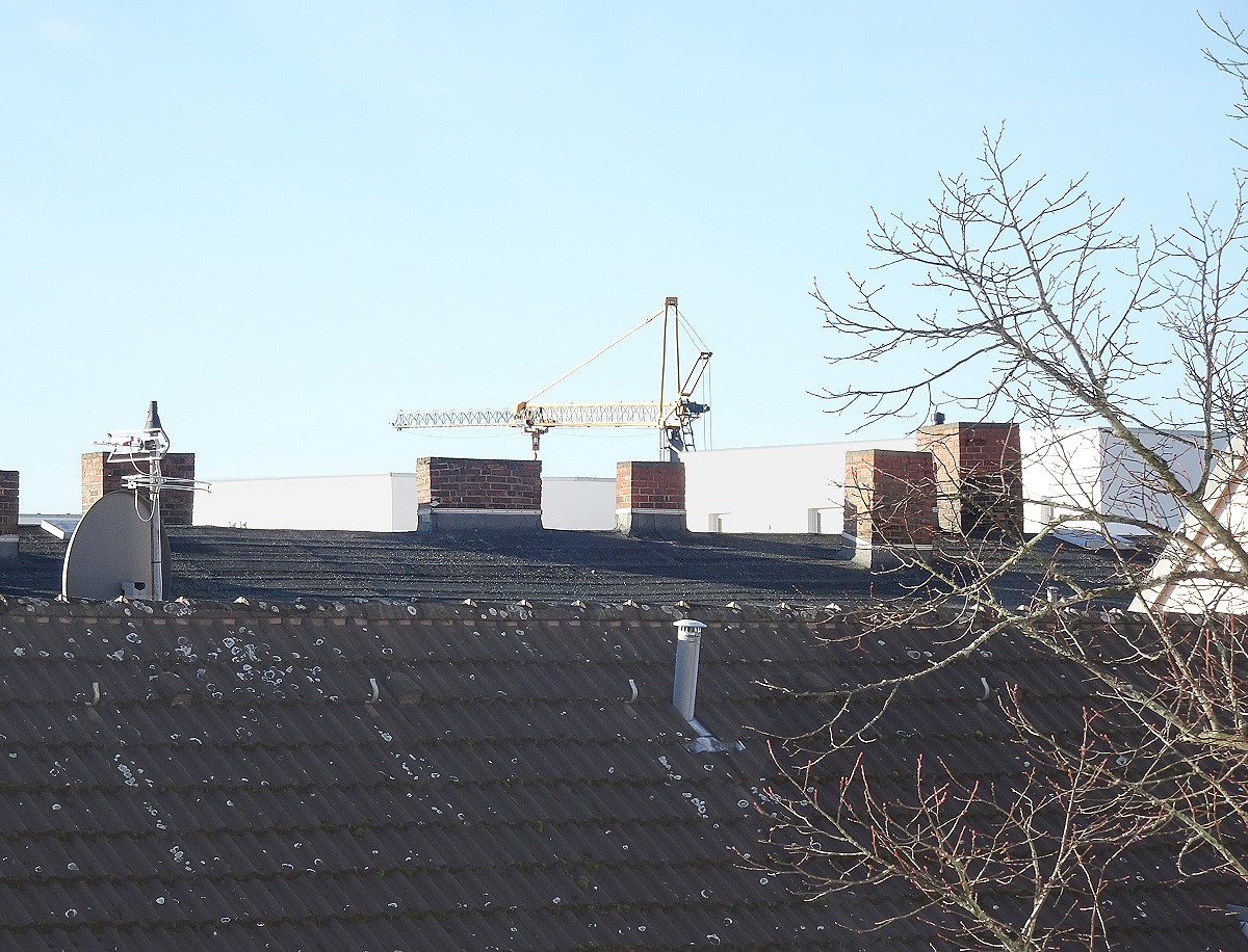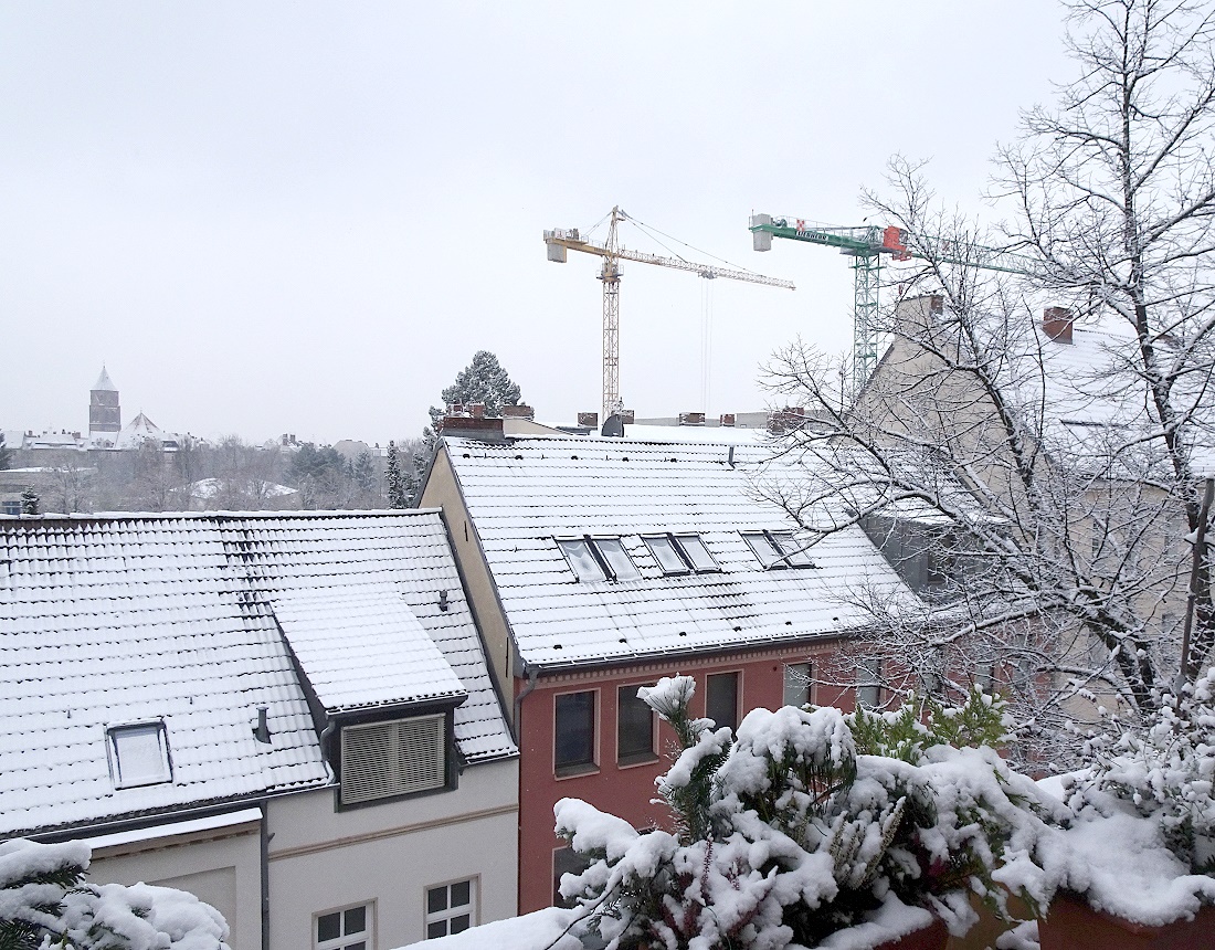 weiter geht es mit dem Blick aus dem Fenster. Nun haben wir hier in Berlin eine Anmutung von Winter zu bieten: Schnee auf den Dächern. Bei der Gelegenheit fällt mir natürlich auf, dass die Bauarbeiten eines Wohnhaus-Neubaues (rechts im Hintergrund) schon über 13 Monate andauern. Also sind mir die Drehbewegungen der Kräne und deren Betriebsgeräusche schon sehr vertraut geworden...