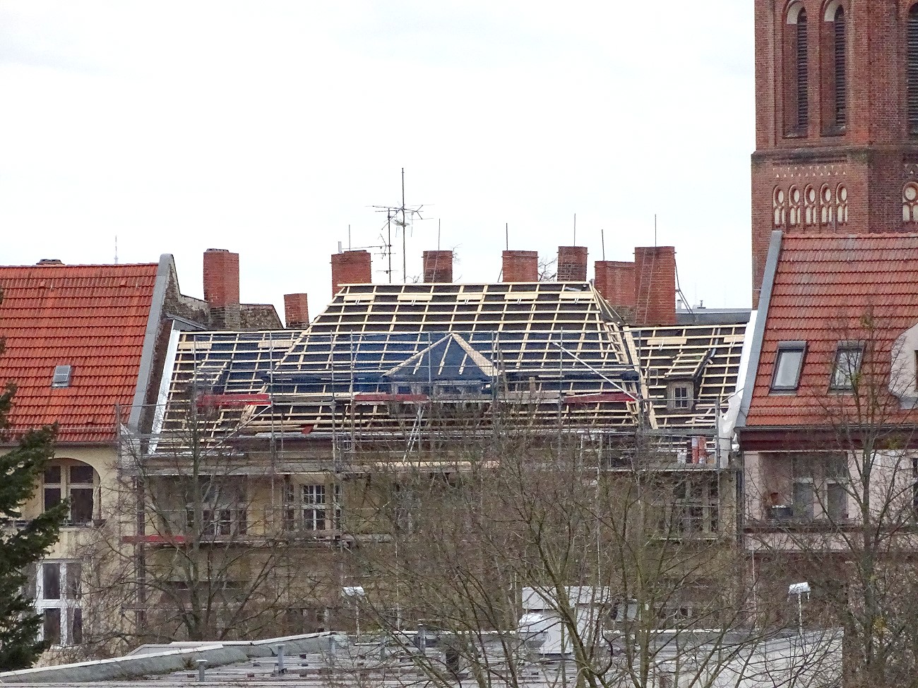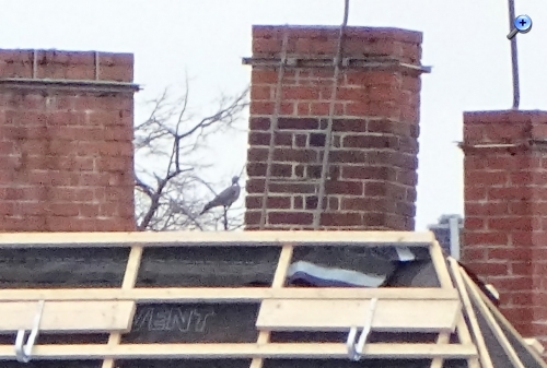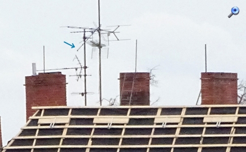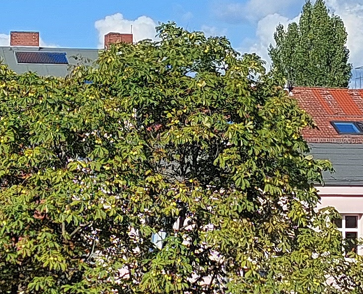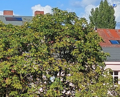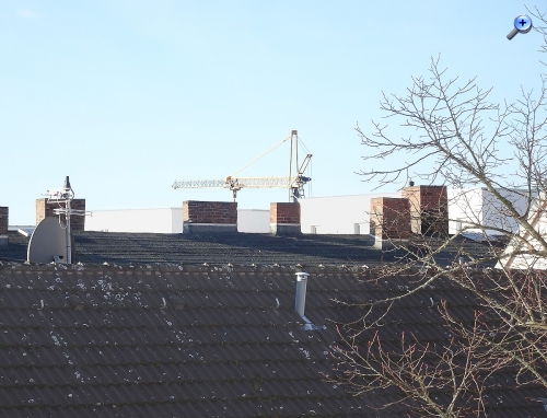 Da musste die Sony HX400V ran um zu sehen, ob das Dach in 370 Meter Entfernung auch ordentlich neu gedeckt wird. Als "Beifang" stellte sich noch eine Taube dort hinter dem Haus (nochmals 100 Meter weiter) im Baum zur Verfügung.