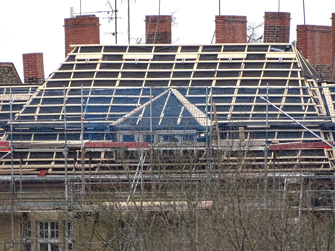 wieder mal ein Blick aus dem Fenster. Seit fünf Monaten wird unser Haus neu gestrichen, Fensterfronten komplett erneuert, Balkonterrassen-Böden neu verlegt / isoliert. Deshalb wird der Blick durch Gerüst und Netze getrübt.