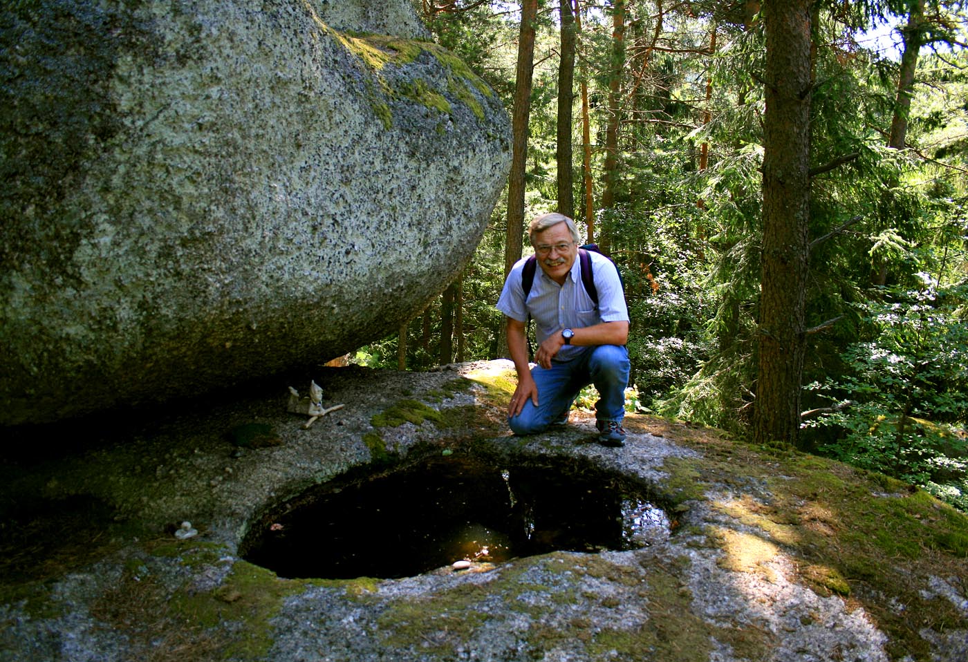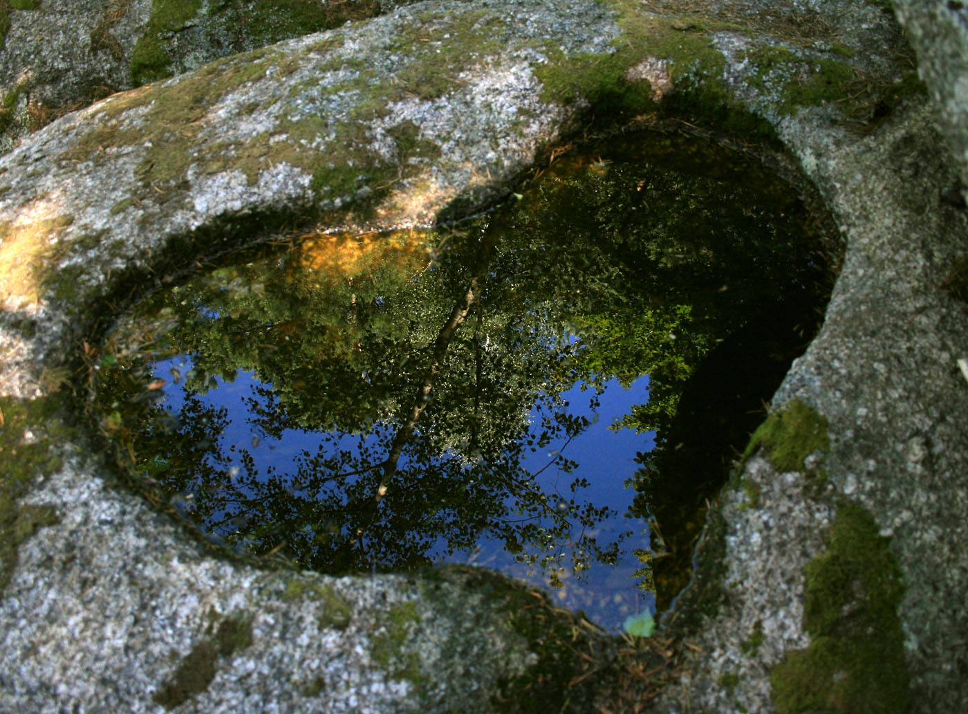 Schalensteine in den verwitterten Granitfelsen des Mühlviertels in Oberösterreich sind keine Seltenheit. Die in Jahrmillionen vom tropfenden Wasser ausgehöhlten flachen, wassergefüllten Schalen sind in der Regel kreisrund. Dieses Herz mit der Spiegelung des umgebenden Waldes dürfte aber ein Unikat sein.