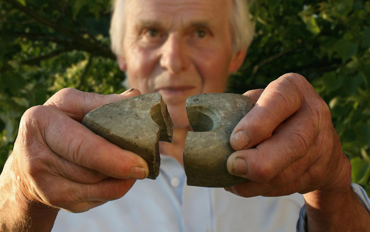Der Altbauer vom Oberhuemergut in Puchenau fand auf seinen Feldern diese beiden zusammenpassenden Teile eines zerbrochenen neolithischen Steinbeils im Abstand von einem Jahr. Canon EOS 400D, 18-55 mm