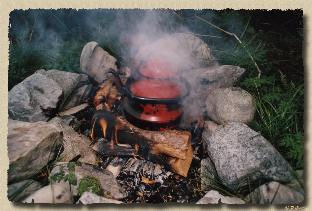 Dies Bild entstand bei einer Wanderung. Früher hatte ich über einige Jahre bei Tageswanderungen immer die rote Kanne, Blechtassen und Kaffeepulver im Rucksack. Nein, ich habe für dieses Feuer nicht einfach so ein Loch in die Natur gebrannt, sondern eine bereits bestehende Feuerstelle genutzt, die zu einem Windschutzhäuschen gehörte. Sie war schon fast ganz zugewachsen. Der Pfad, an dem dieser Windschutz steht, wird wohl nicht häufig begangen. Jedenfalls nicht von Leuten wie uns, die solche Feuerstellen auch benutzen. Diesmal war ich faul und habe die Kanne einfach und ohne Schnörkel direkt auf das brennende Holz gestellt...was auch funktionierte.