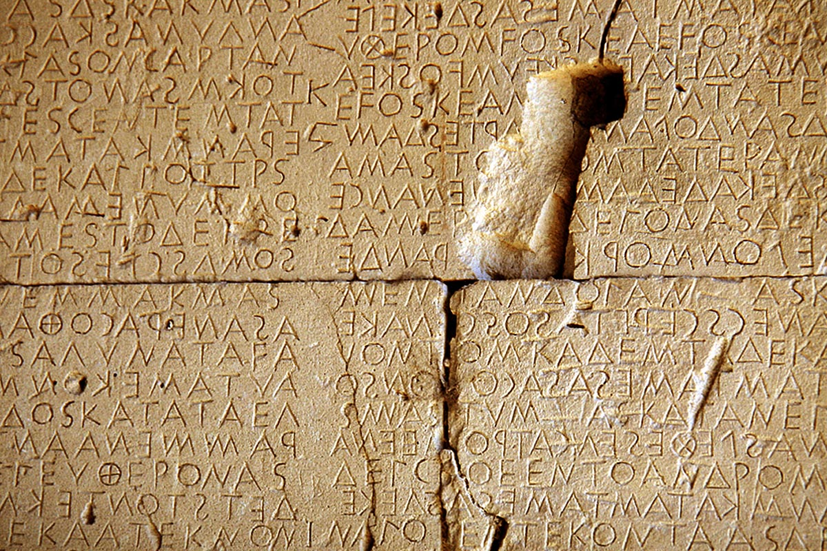 Der Gesetzestext der Stadt Gortyn in Südkreta aus dem 5. Jh. v. Chr. Der Text auf den Sandsteinblöcken ist "boustrophedon", d.h. "wie der Ochse pflügt" zeilenweise von links nach recht, dann von rechts nach links, usw. zu lesen.