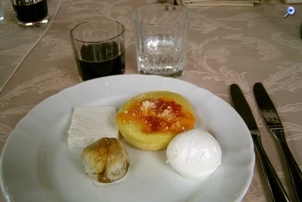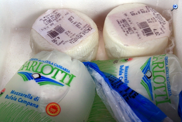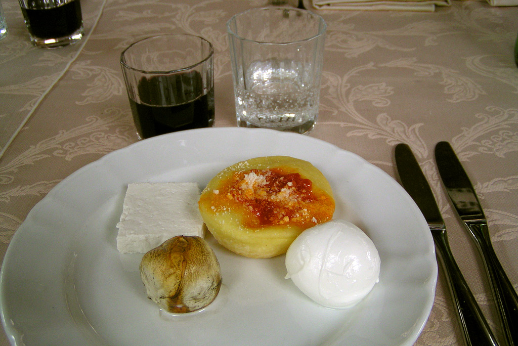 Die weiße Kugel rechts ist der schmackhafte Mozzarella aus Büfffelmilch, links in geräucherter Form. Links oben der Ricotta, das Ausgangsprodukt, und dazu eine kleine Pizza.