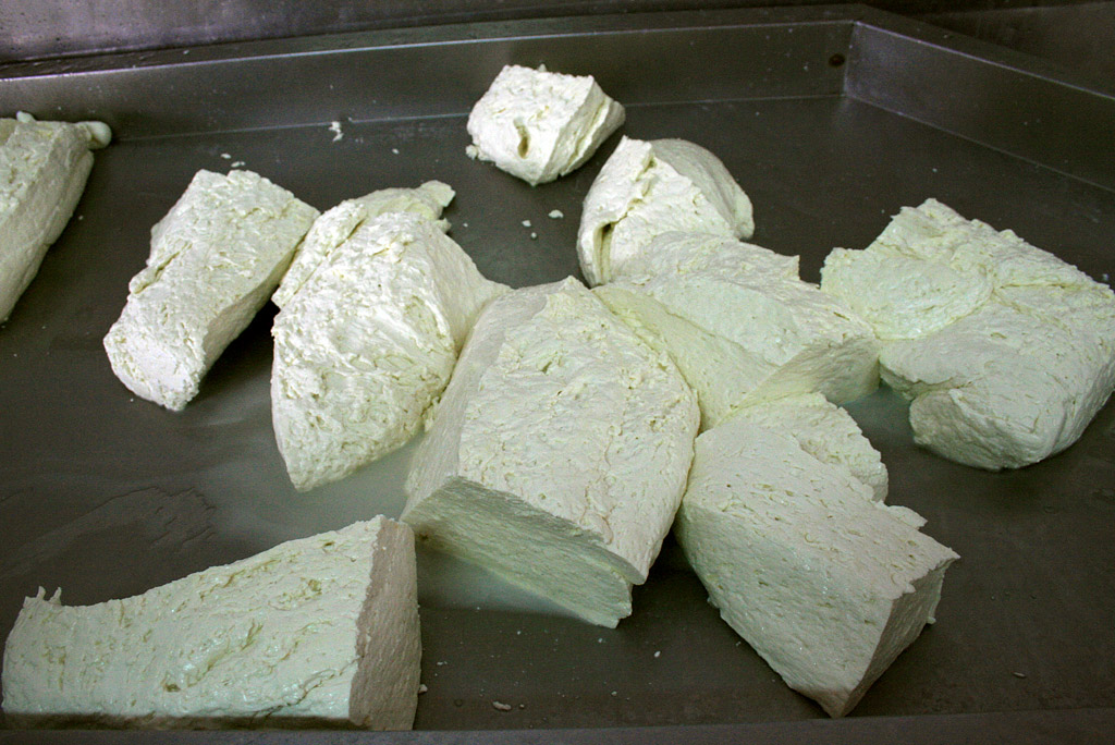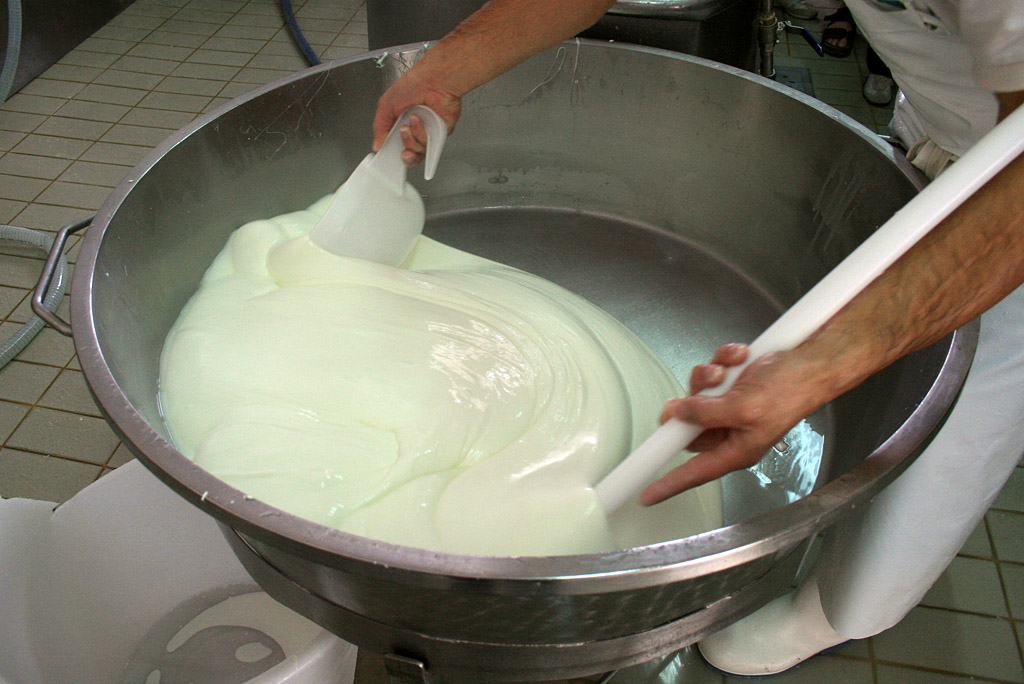 Nach langem Rühren der Büffelmilch entsteht der grobkörnige Ricotta Käse.