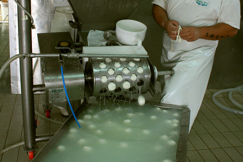 In der Portioniermaschine entstehen die typischen Mozzarella Kugeln