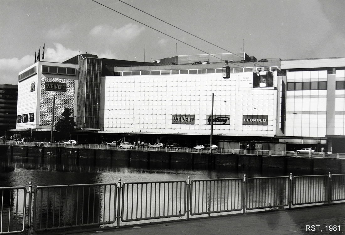 eine Aufnahme von 1981 in Kiel. Zeigt das Kaufhaus Weipert. Schaut man genau hin, sieht mal eine Gondelseilbahn, die das Kaufhaus mit dem Parkhaus verbindet. Wurde Ende der achtziger Jahre ausser Betrieb genommen.
