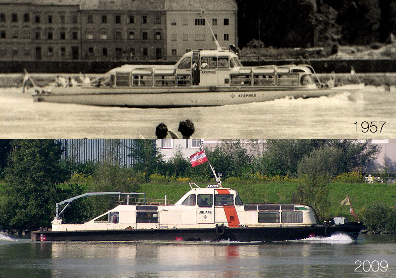 Vor bald 60 Jahren habe ich als Schüler eine Agfa Isolette I mit Objektivdefekt geschenkt bekommen und 1957 damit einen der damals aktuellen "Donaubusse" in Linz fotografiert. Jetzt habe ich beim Stöbern in meinem Archiv dazu ein Bild des Schiffes, fast 50 Jahre später fotografiert, gefunden. Das Schiff dient jetzt als Arbeitsboot und hat den Namen Juliane.