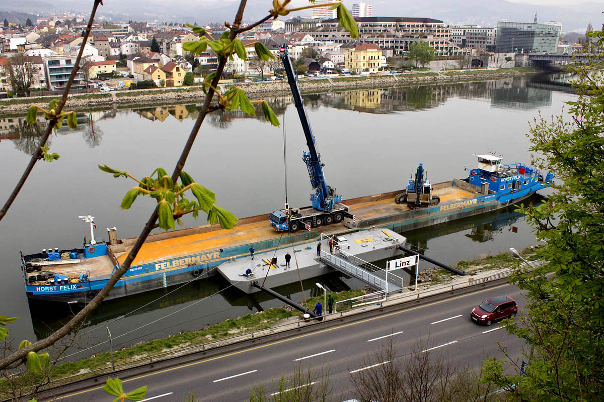 Heute ein Arbeitsschiff: Das Schwerlastschiff "Horst Felix". Das 86 Meter lange Schiff mit einer Tragkraft von 1.440 Tonnen hat zwei absenkbare Grundstützen um ein Neigen des Schiffes bei Kranarbeiten zu verhindern. Auf dem Bild wird ein Anlegeponton am Donauufer in Linz verankert.