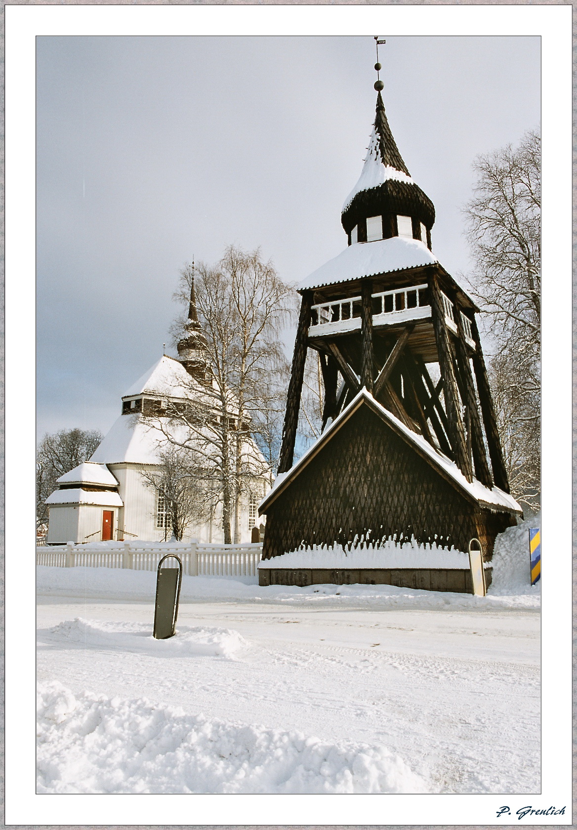 der Glockenturm. Ja, der steht oft frei bei den Kirchen hier oben, die meistens als Holzgebäude erstellt wurden. Die Kirche von Hede ist da eher eine Ausnahme. Aber auch bei dieser ist der Glockenturm eine Holzkonstruktion. Die Kirche im nicht weit von Hede gelegenen Dorf Vemdalen ist ebenfalls - wie auch ihr Glockenturm - aus Holz gebaut.