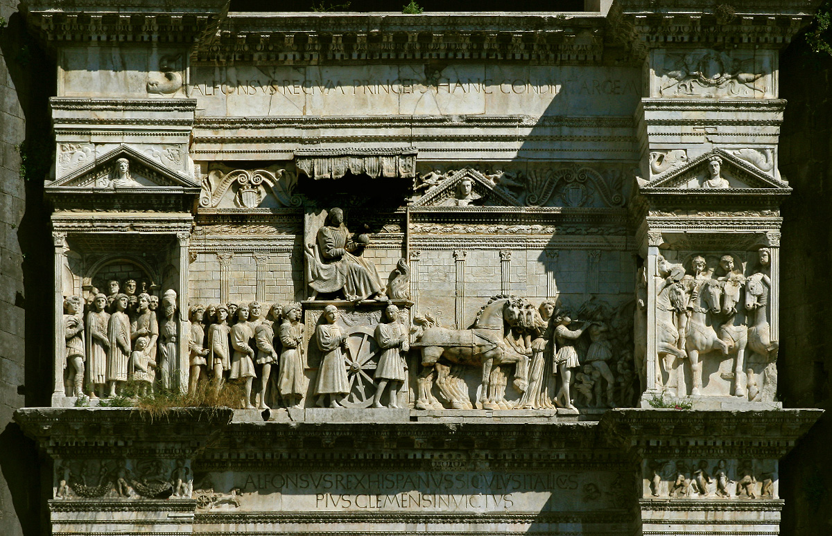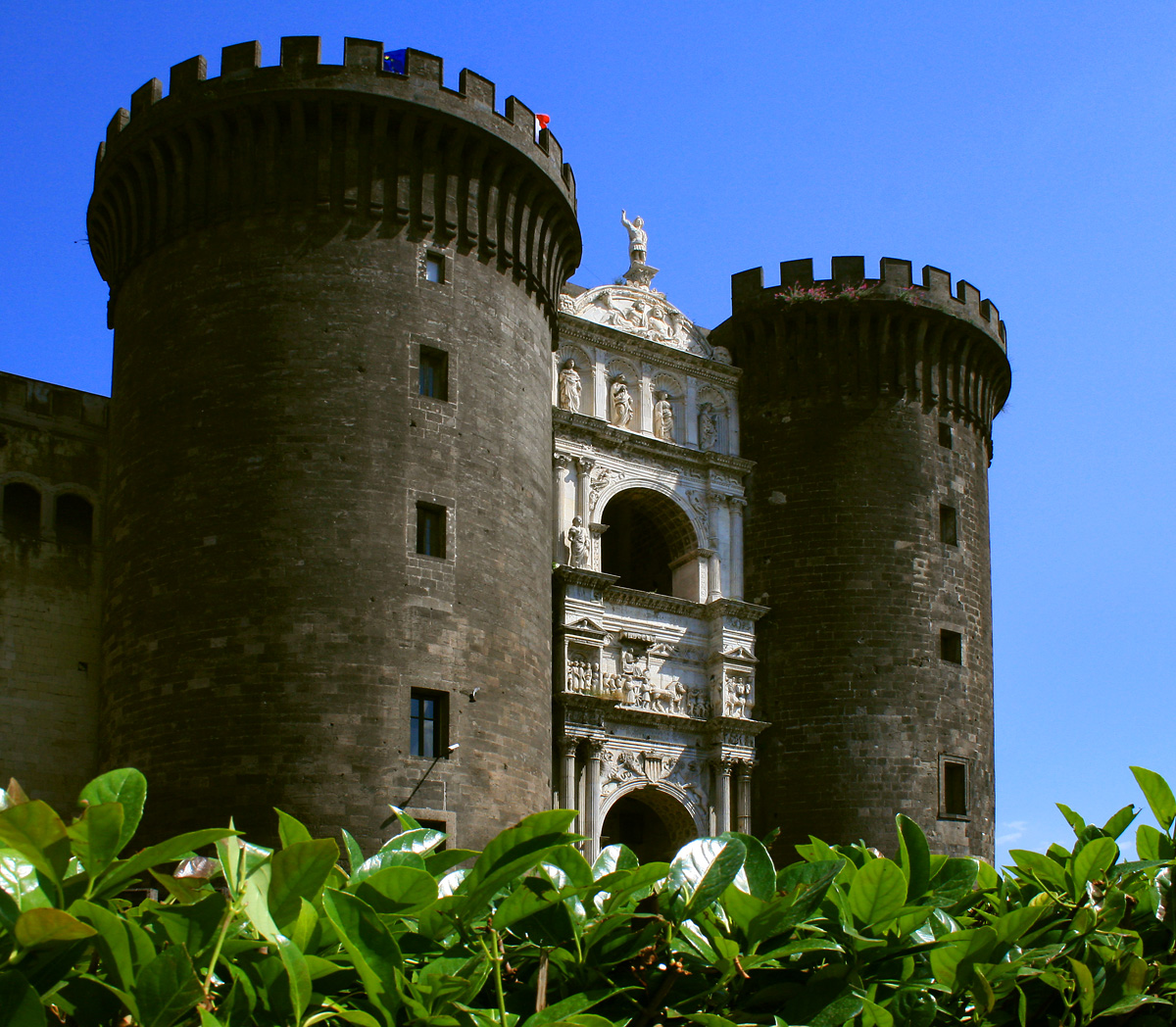 Das aus schwarzen Lavasteinen erbaute Castell Nuovo aus dem Jahr 1280 mit dem 1453 eingefügten Triumphtor aus weissem Marmor, das den Einzug von König Alfons v. Aragon mir seinem Gefolge zeigt.