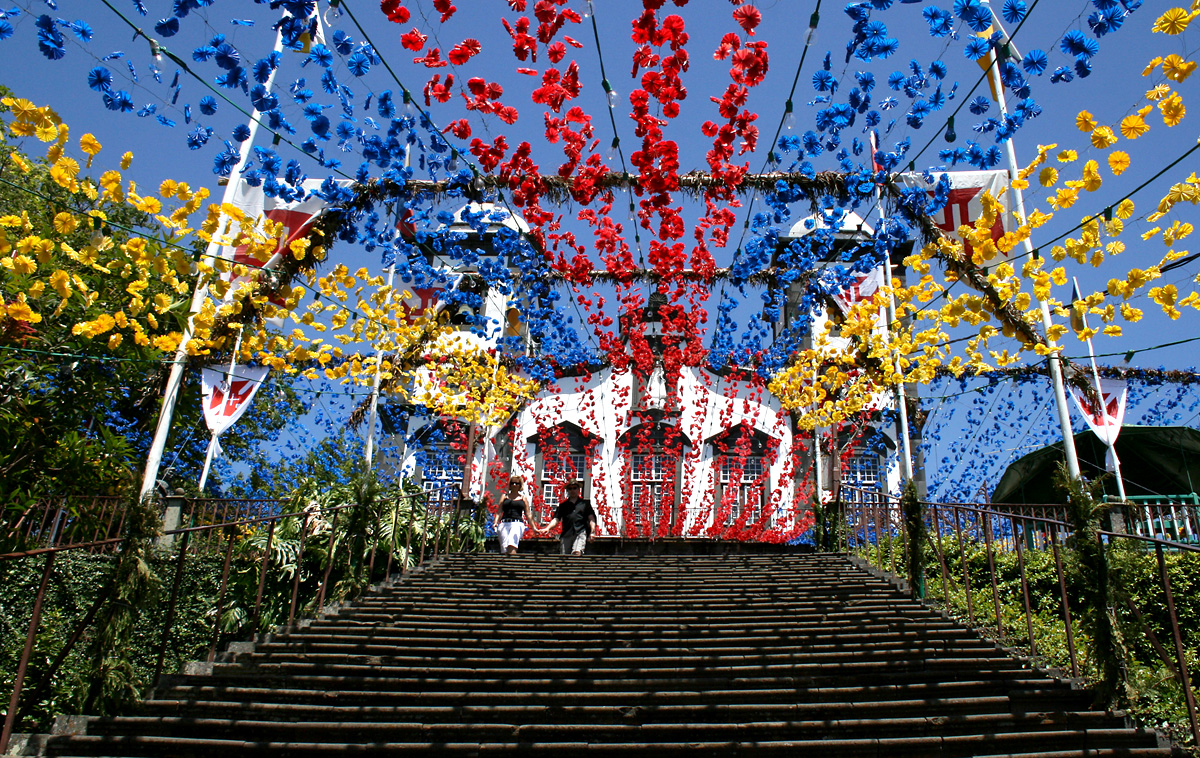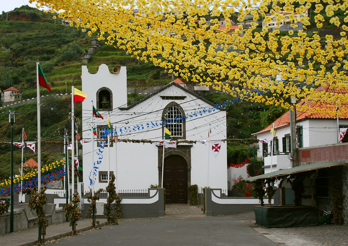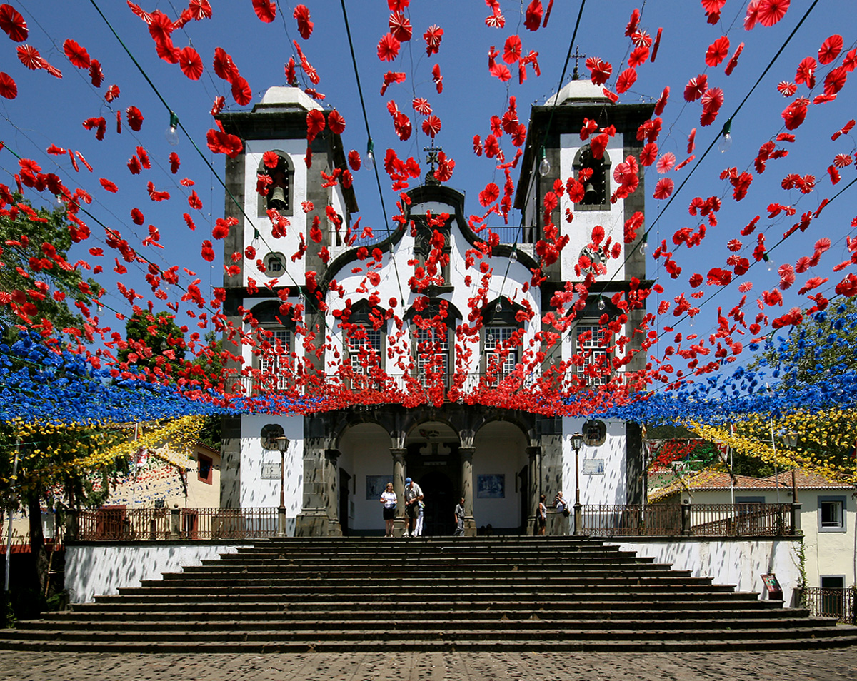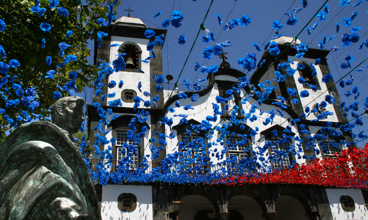 Heute zwei Kirchen von der Insel Madeira im Atlantik. Der Marienfeiertag am 15. August wird in Portugal ganz besonders gefeiert. Dabei werden die Vorplätze der Kirchen mit tausenden bunten Papierblumen geschmückt.