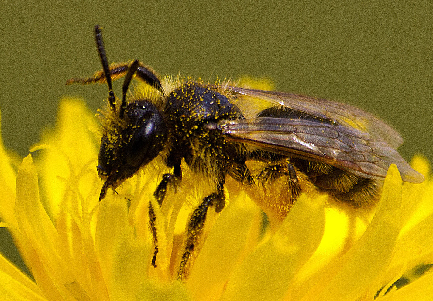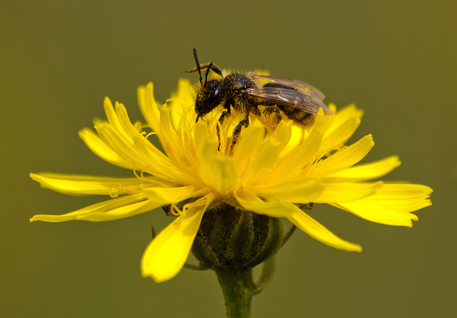 Heute früh um 9:30 Uhr bei leicht dunstiger Sonne und ca. 19° C fotografiert. 300 mm, Bl. 7,1 1/400 sek. ISO 320, max. Macro. Eine Wildbiene der Gattung Lasioglossum , Länge ca. 7 mm, mit Autofokus, Aufnahmeabstand ca. 90 cm.