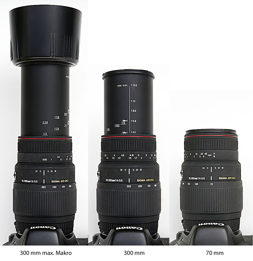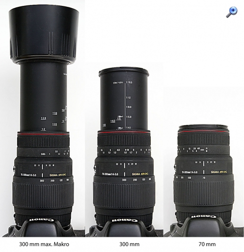 Links: Makrostellung (mit Gegenlichtblende), Mitte: 300 mm, Rechts: 70 mm