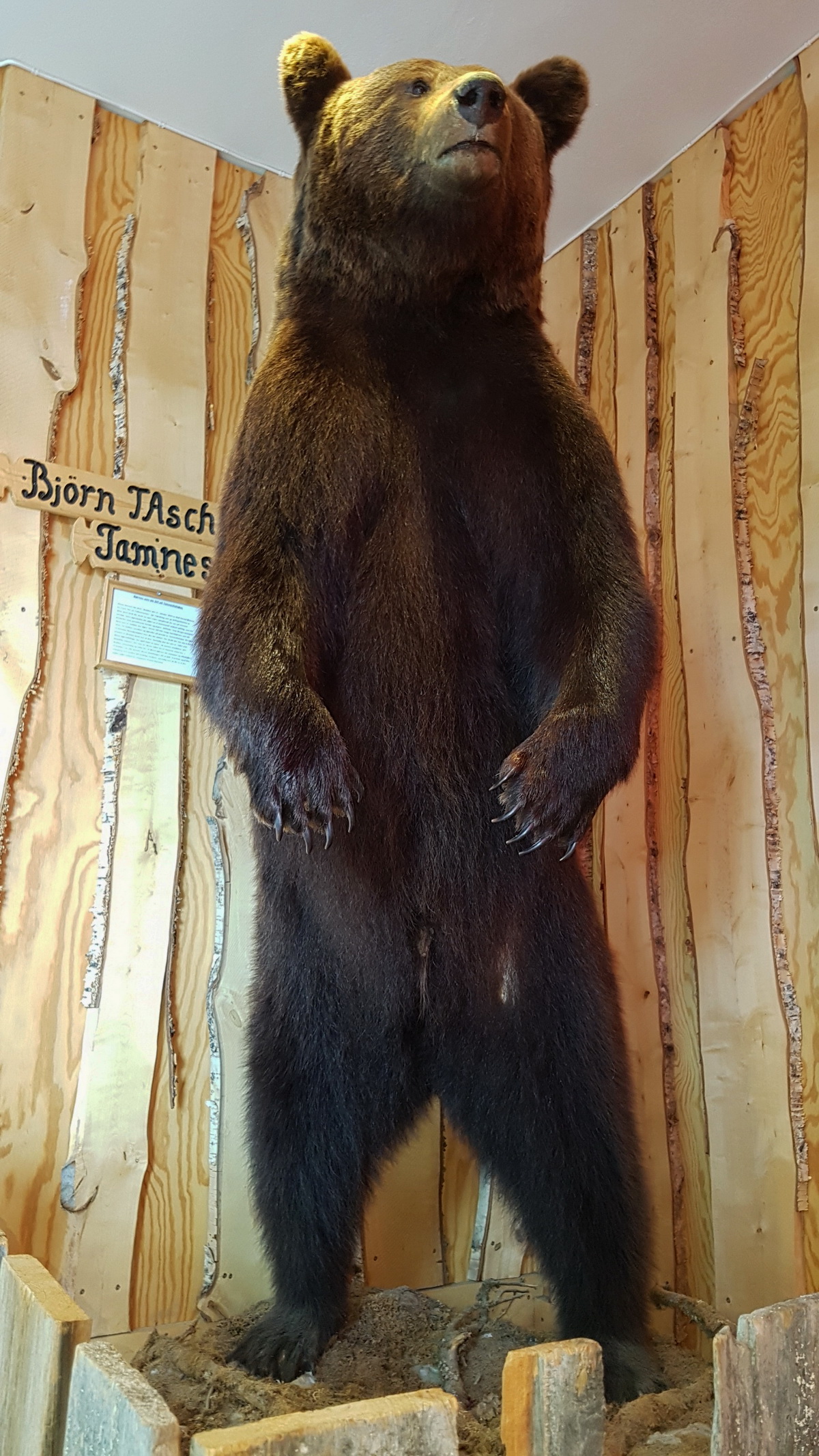 Normalerweise mag ich die meisten Tiere in meinem Dunstkreis lieber lebendig. Bei Bären z.B. mache ich da aus Sicherheitsgründen gern mal eine Ausnahme. Eingefangen im Eingangsbereich des Gemischtwarenladens im norwegischen Dorf Brekken / Röros Kommune mit dem Smartphone. Ein männlicher Bär, in der Nähe von Brekken geschossen, 160 Kilo Lebendgewicht, etwa eine Handbreite größer als ich. Ich bin 1,80 m lang.