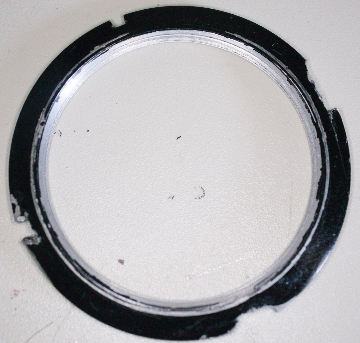 Im Prinzip hast Du völlig recht. Otti hat zu seinem Glück kaum mit einem Ring zu kämpfen, wie er Verschlüsse am Balgen hält - die sind ja keineswegs immer leicht entfernbar. Das geht so weit, daß nur "fast" passende Ringe verwendet wurden ... dazu ist zu sagen, daß wegen ungenügender Fertigungstoleranzen bis in die 1920er-Jahre selbst bei passenden Ersatzteilen - z.B. zwei Compuren derselben Größe! - Objektive und Ringe nicht beliebig tauschbar waren. Das fällt bei Vor-WK I - Kameras i.d.R.nicht auf, da wurde normalerweise nicht so getauscht. Der folgende aus einem aktuellen Fall*) war zufällig ohne weitere Beschädigung abschraubbar, ich habe danach die schärfsten Grate beseitigt: Vor seiner Wiederverwendung muß ich mir überlegen, wie ich ihn wieder abschraubbar mache. Leider kann ich mangels Werkzeug keinen neuen machen. Wenn ein Ring so aussieht - oder schon früher - die Schlitze also alles andere als senkrecht abfallen, und zudem nur ein ganz klein wenig fest sitzen - sie können extrem fest sitzen! - dann kann jeder Versuch des Lösens scheitern und jeden weiteren Versuch weiter erschweren. Es gibt dann immer noch Möglichkeiten - man kann den Ring z.B. an zwei gegenüberliegenden Stellen vorsichtig anbohren ... (geht leicht - aber nur, wenn der Ring abgeschraubt ist ...).