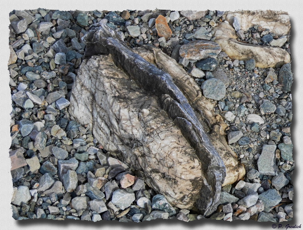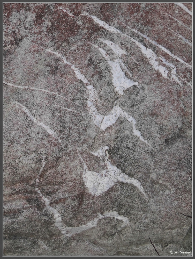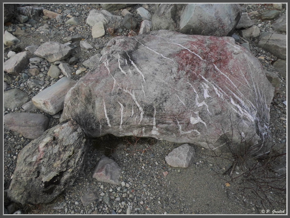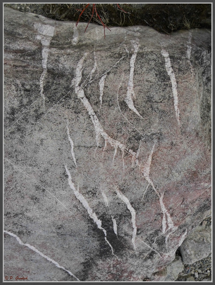 Und noch einen interessanten Stein habe ich gefunden. Teilweise rötlich an der Oberfläche und durchzogen von einem weißen, anderen Material, vermutlich Quartz. Irgendwie wirkte das auf mich wie geheimnisvolle Schriftzeichen.