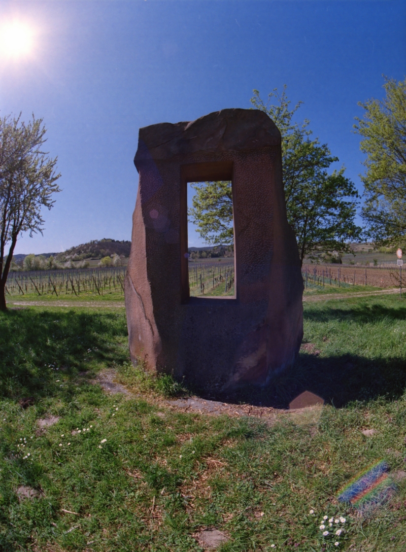 Anbei "Das Fenster zur Pfalz" in Wachenheim. Aufgenommen mit Mamiya 645 Pro, Fischaugenobjektiv 24mm und Kodak 400 Film. Mein Abstand zum Stein war ca. 2 Meter.