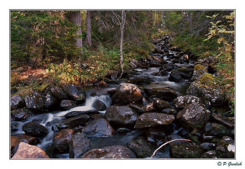 Kammarbäcken nennt sich dieser Wasserlauf. Er ist nicht untypisch für diese Gegend, in der die letzte Eiszeit überall ihre Geröllhaufen verteilt hat. Endmuränengebiet nennt man sowas wohl, wenn ich mich nicht irre. Die Steine sind glitschig und das Gelände ist im Ganzen recht schwierig zu begehen. Überall wuchert Moos auf verborgenen Spalten und Löchern. Ein idealer Ort, um sich die Beine zu brechen.